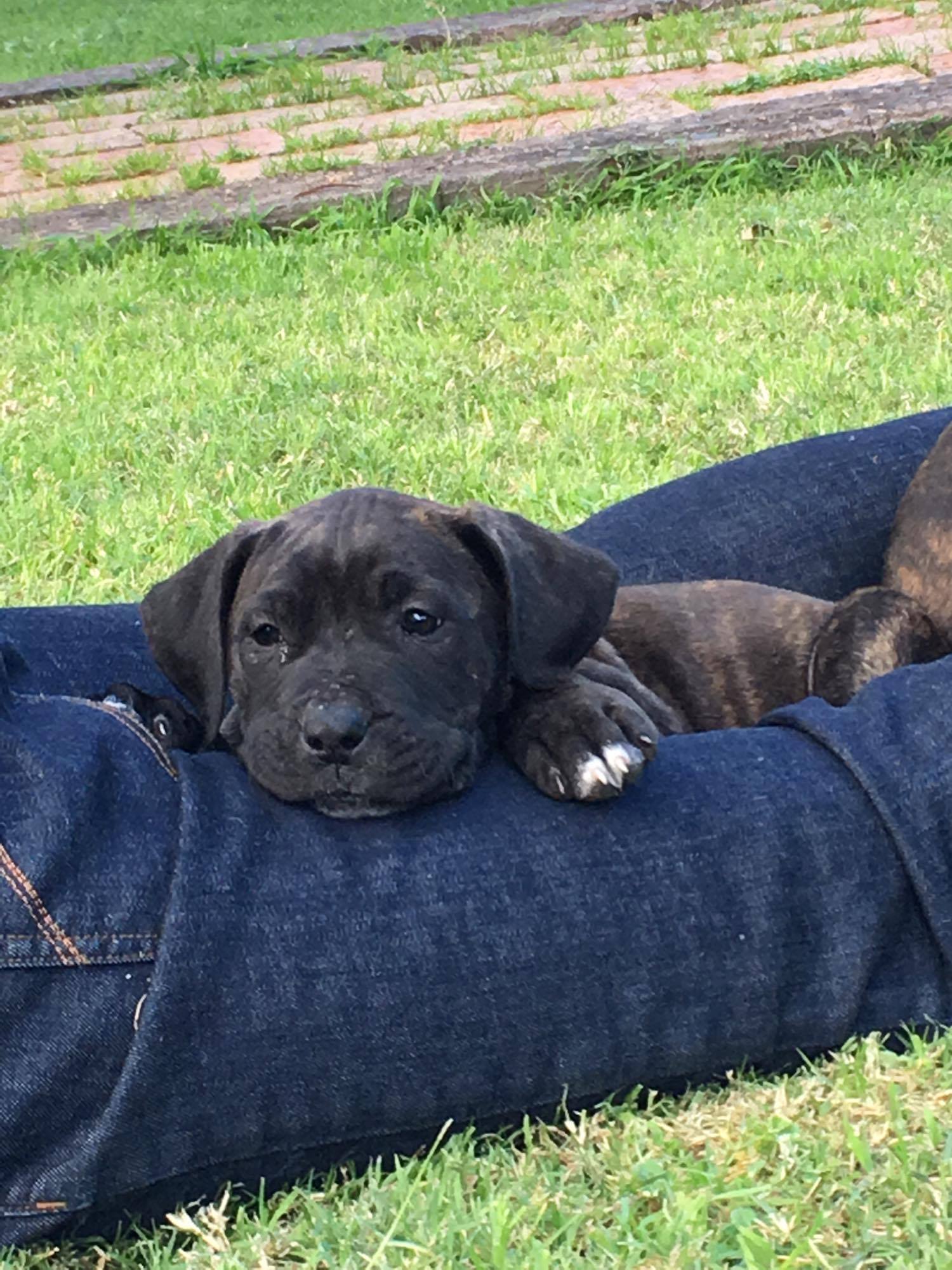 Rebel is a dark brindle colour with a little bit of white on her back paws.