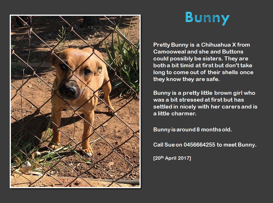 Pretty Bunny is a Chihuahua X from Camooweal and she and Buttons could possibly be sisters. They are both a bit timid at first but don't take long to come out of their shells once they know they are safe.