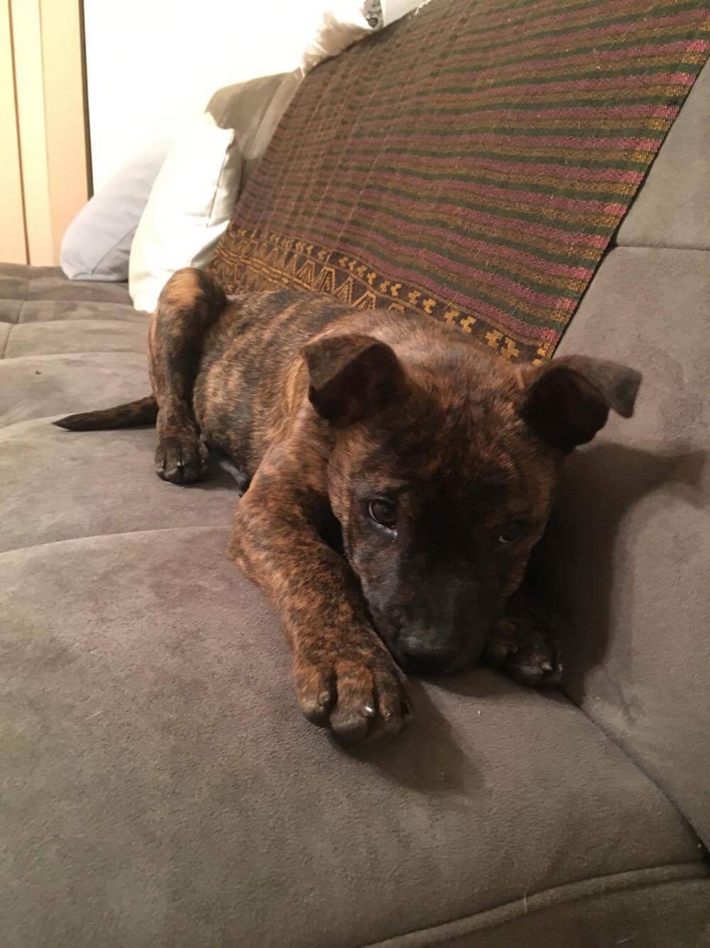 He is a playful 10 week old staffy mix. He is a very outgoing pup that loves to play with his foster sisters. He would be best suited to a family with another dog as he doesn't like to spend too much time alone. He loves to be with his human family and is happy to just cuddle on the couch at night. He is happy to spend his days outside with his foster sister while his carer is at work and also sleeps outside with her without issue.