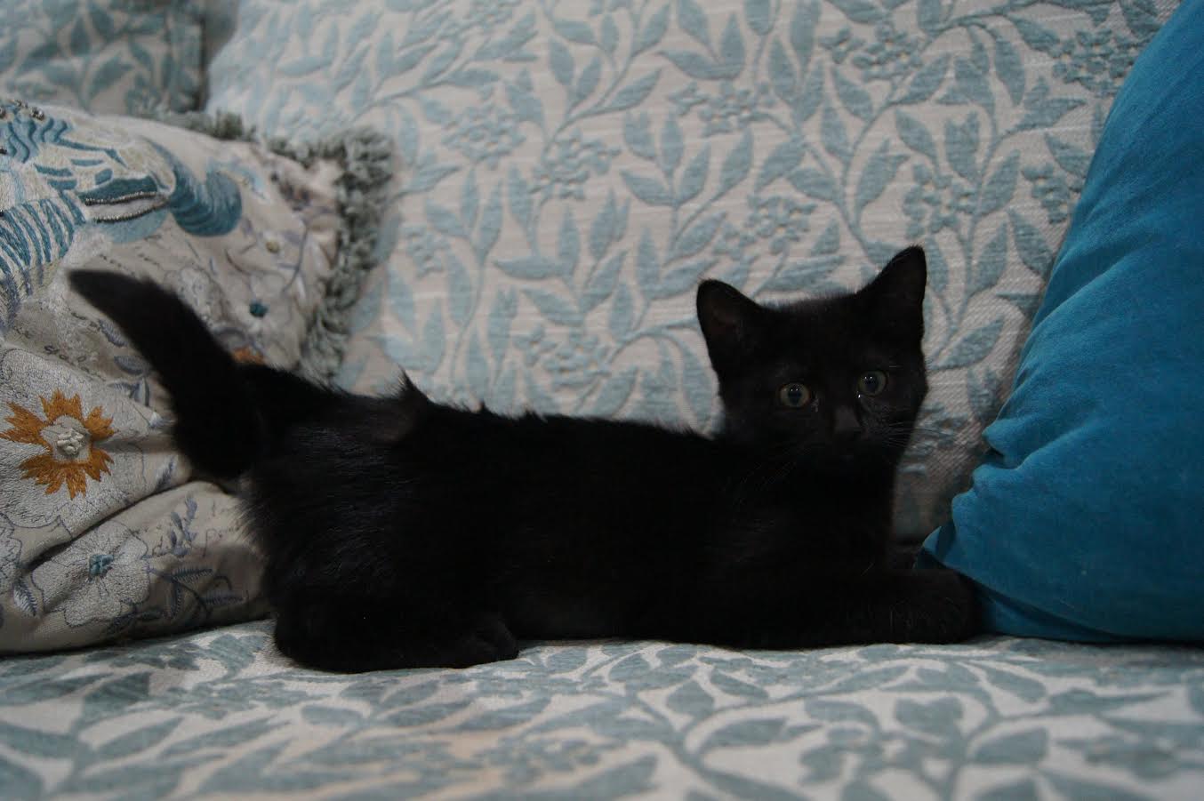 "Ga-linda" is named after the Good Witch of the North because Black Cats are magical and she would be a fantastic addition to any Witch or Muggle's household. She has just discovered how much she likes being on the couch so be prepared for lap lounging and TV watching. She will let you know if she needs anything with a couple of meows and some outreached paws. Galinda will probably need a bell on her collar because she is good at hiding and sneaking off quietly... and is equally good at popping up next to you, or running around like it is the witching hour. Her favourite place to be scratched is her butt, it has been her biggest discovery. She is pretty cat friendly as she loves to run and play with her siblings, mum and other fosters. Galinda starts off a little timid but warms up to people if they promise cuddles, treats and bum scratches!