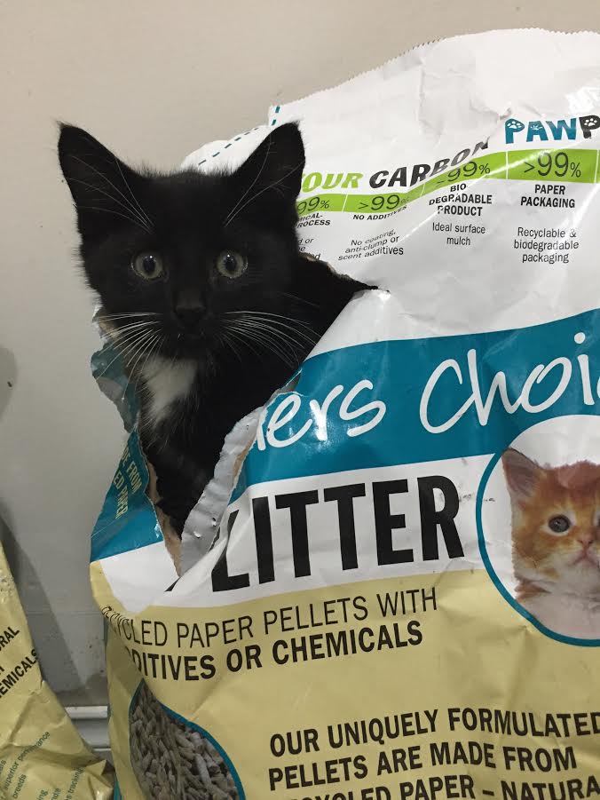 If given the opportunity, he will go off exploring and often makes his way into food bags to help himself to a snack, or even sits in kitty litter bags or boxes. He is a curious explorer.