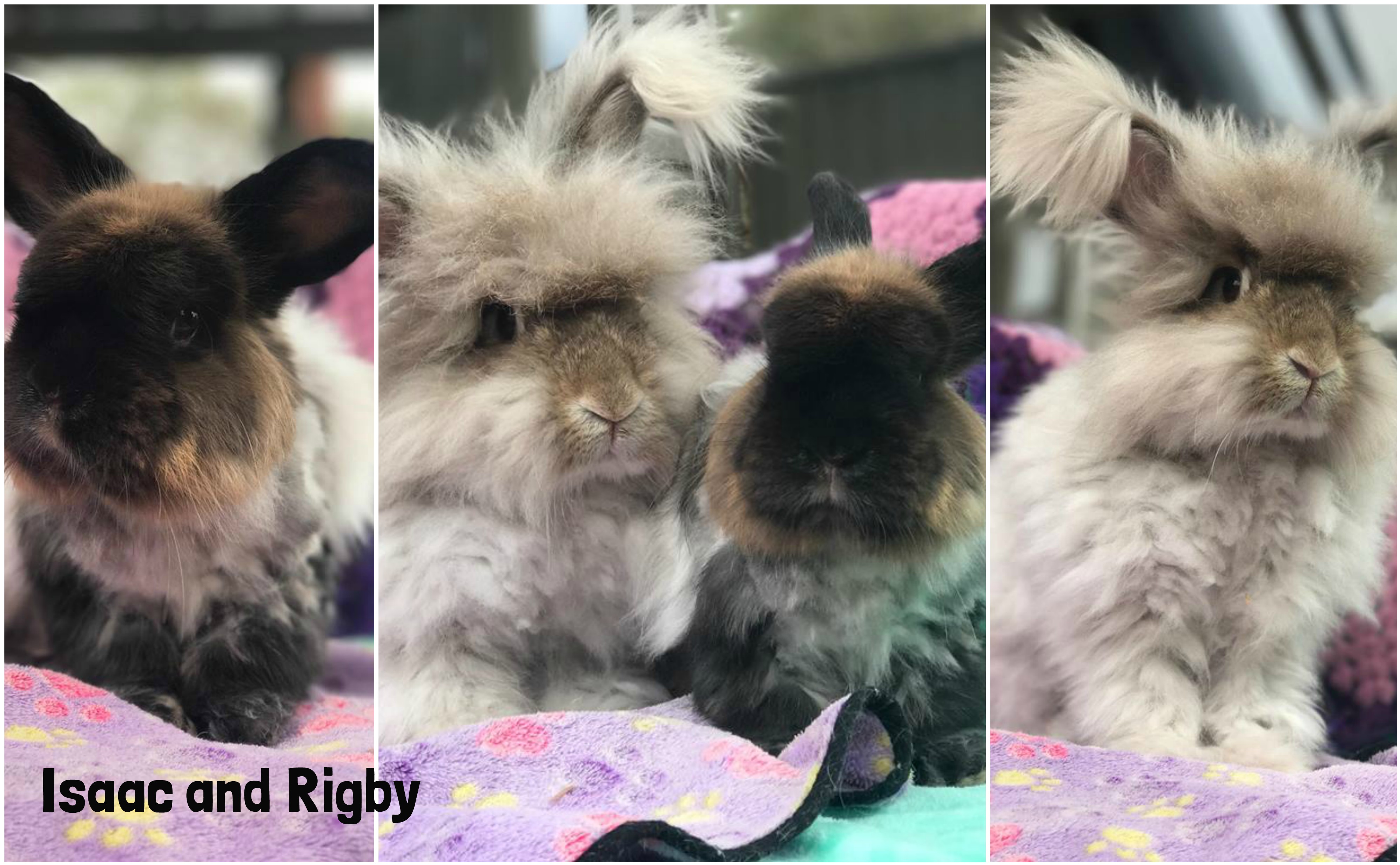 Isaac and Rigby are very friendly buns. True to the angora nature they are very laid back ang get along with just about anyone. These bunnies are currently in foster care with cats,dogs,and chickens. Not much phases them, they will adjust to almost any home. They do require daily brushing. However we do offer lifetime grooming with adoption of this pair.
