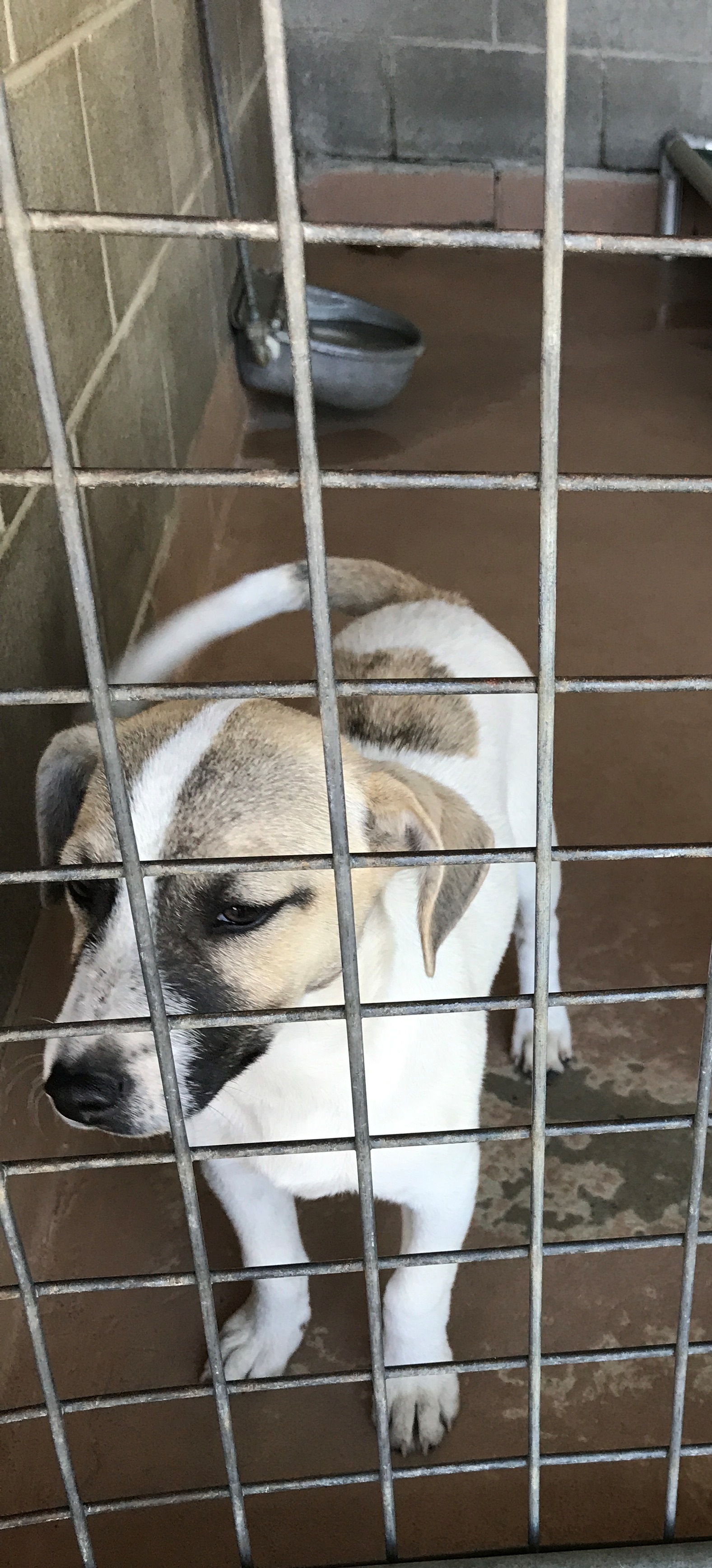This little girl (White with Tri markings) came in with his sister and is only around 3 months old. Estimated to be Bull Arab x Kelpie. These pair love pats and would make a perfect family pet as they are young and would love to fit into a family who will take them for walks and start training and dog sports with them.