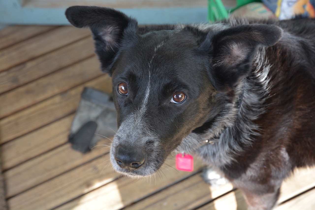 Nellie is about 4 years old and is a blue heeler cattle dog cross. She is black and white and grey with flopped over border collie type ears that don’t stand all the way up. This gives her a cute and goofy sort of look.