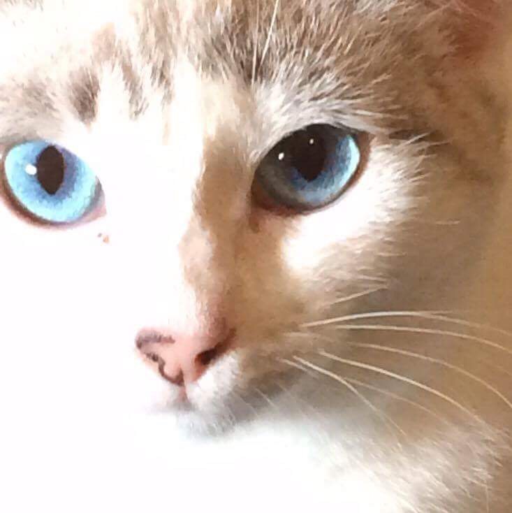Marie is a unique white beauty with big blue eyes and a stripy tail and hat!