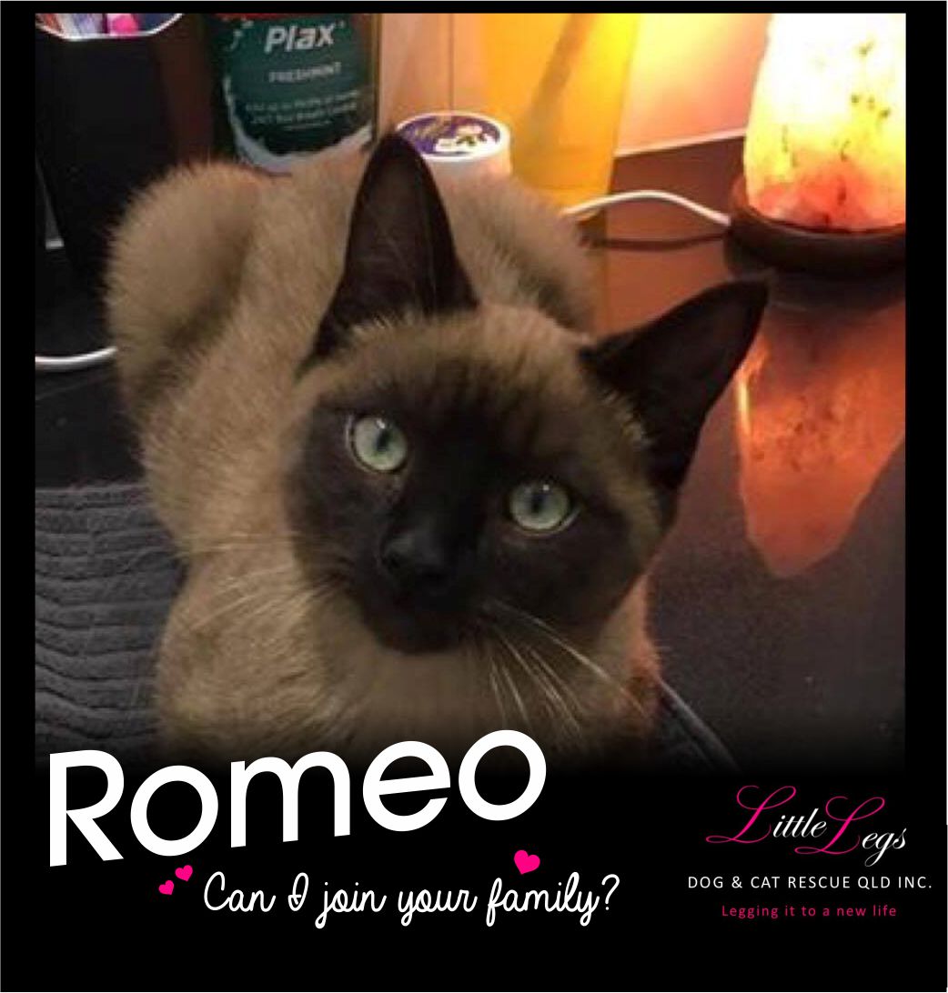 Romeo is the man himself. Just like Romeo and Juliette he steels your heart. If he's not meowing for kisses (literal kisses) he's rolling on his back wanting you to stroke him and give him love. For a little man he's a big eater he loves his wet and dry food. He's met my dog and get along with it but is a small dog and I assume will be okay with other cats. He is himself a rare man just like romeo was. Please adopt the cutie pie he deserves all the loves and kisses he can get.