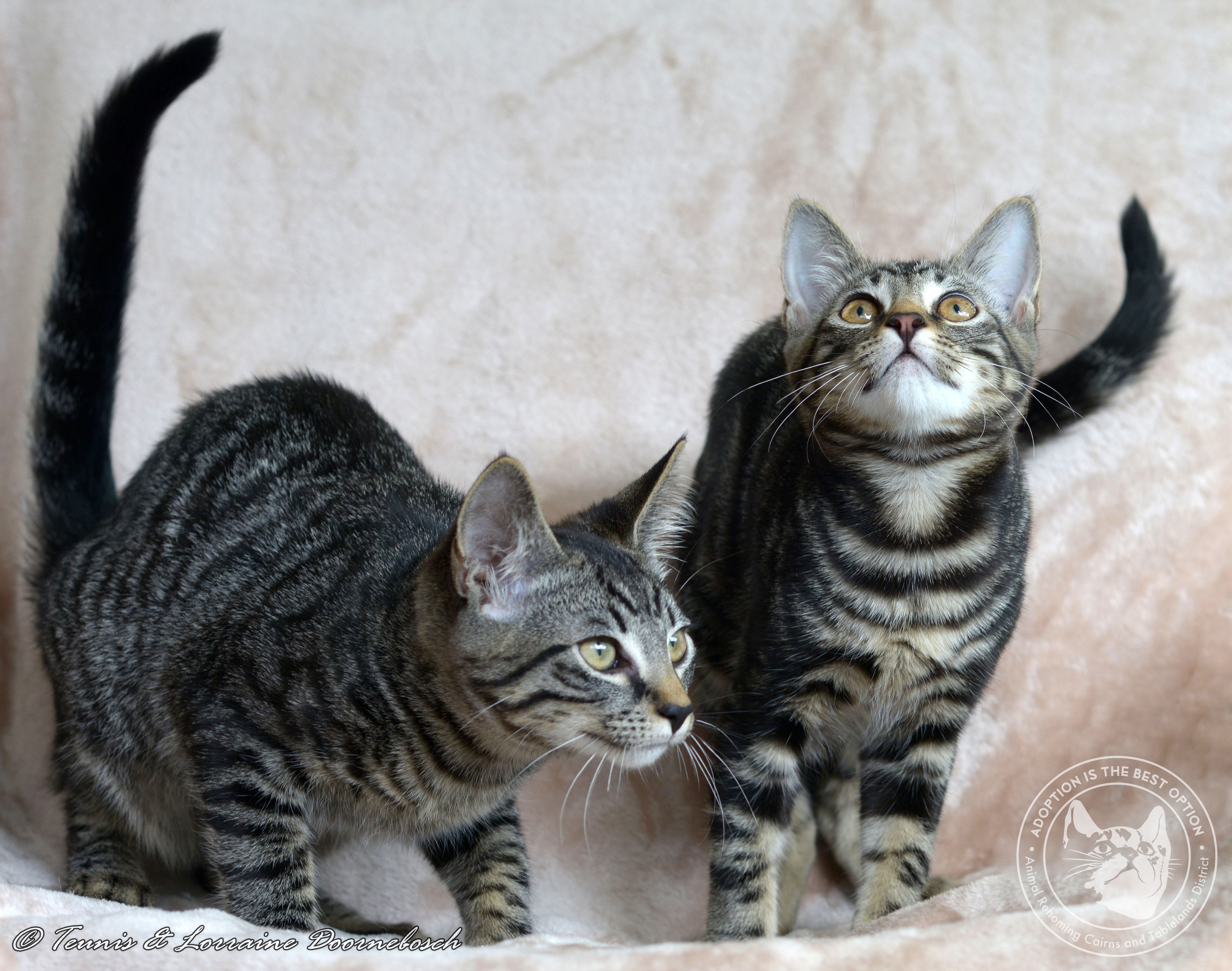 Quigley & Quentessa were born 01.05.17. Their Mumma cat, Quenby, found a safe place near a house to have her babies and luckily the homeowners' felt she needed help and rescued her and her babies. Quentessa is the most gorgeous classic black tabby, just like her mum. She is a wonderful little girl who loves to be cuddled gently. Quigley loves to play and run, play and run but, he's more than happy to have a cuddle and smooch and will come looking for just that when he's worn himself out. He will sit on your lap and reach up with his front legs, wrap his arms around you and snuggle in. They love each other too, so we really watn them to stay together. All their vet work has been done and includes desexing, microchip, vaccinations, flea and worm treatment.