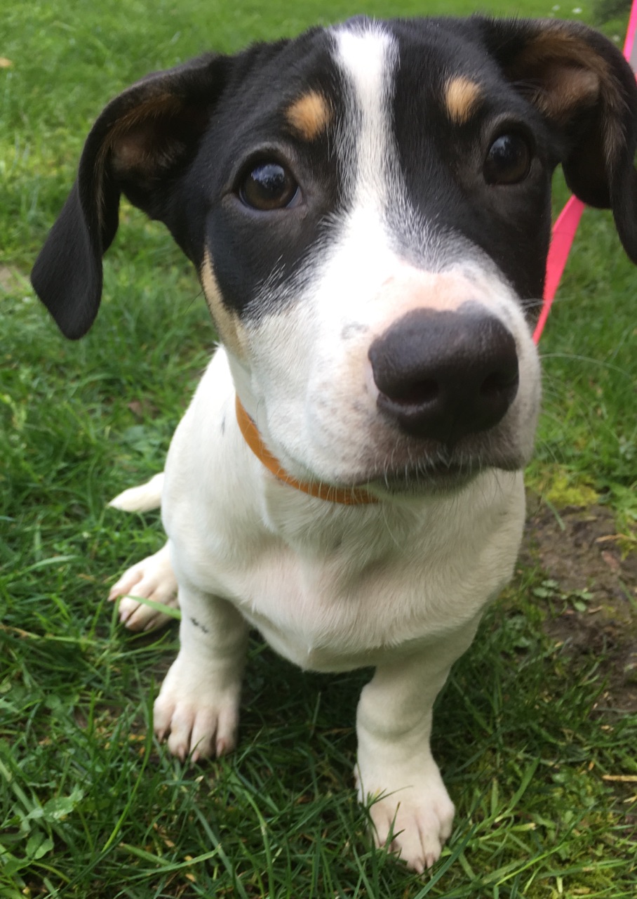 They are just happy, healthy pups who we believe will be of a medium size. Polly has short stumpy legs rather like a corgi so won't be a tall dog. They are about 3mths old.