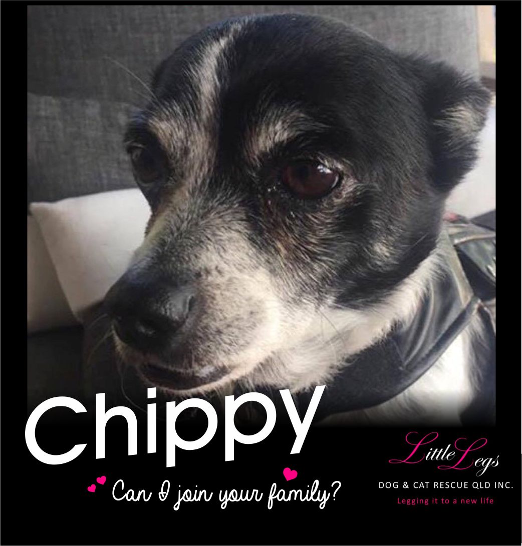 Hi there, I'm Chippy. Now that I've caught your attention with my sweet face and cute pokey out tongue, let me tell you about self! I am a very sweet little old man, who is totally chilled and content to sleep alot and have lots of pats. My life has been a little hard, I have been passed around and my last owners gave me up after having me for three years (I can't understand why, as I am no trouble at all!) I'm now looking forward to a bright future with my new forever people! I have a great appetite and I'm looking forward to a quiet home with lots of yummy food. I have a a few missing teeth so I prefer soft meals. My health is good for my age and I am still active, loving short walks. I prefer to be with people, so someone who is home a lot would be just perfect for me. I am not an escape artist at all, but given that I am quite little, good fencing (no gaps) would be preferable. I am definitely an inside dog and love to snuggle up in your bed at night. I like other dogs but am not fussed if I'm your one and only. If not I'd prefer to live with a smaller dog who isn't too full on. I haven't met any cats or kids lately so not sure if I like them or not, but I'm so very chilled, I can't imagine that I wouldn't. I think someone in my past was rough with me, because I flinch a little if someone touches me unexpectedly, but LOVE belly rubs and lots of pats. I'm very smart, and like to observe what's going on and then adapt to new situations accordingly. I'm not clingy and like to sit and think on my own sometimes (still making sure you are close by out of the corner of my eye 😉, but am very happy to snuggle up on your lap and watch tv with you too. So as you can see, I'm pretty awesome. We should meet! Until then, licks and cute pokey out tongue face, Chippy xx
