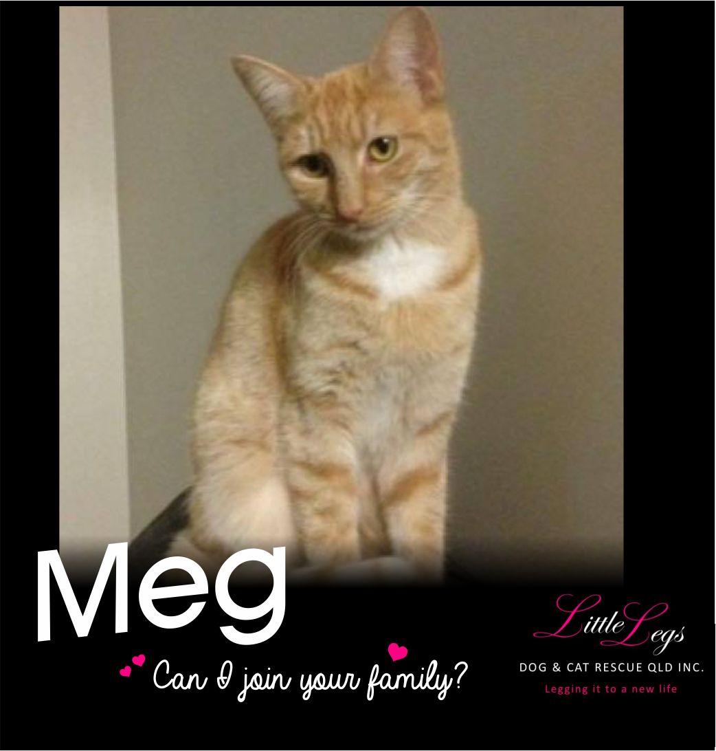While she hasn't been exposed to dogs while in care, she does live with other foster cats. Meg is learning to accept they all live in the same home, but she would rather be the only girl in your heart or at the very least not have to share your lap during snuggle time.