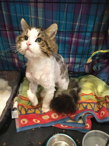 Boris is a very fluffy boy but it was discovered that he was covered head to toe in painful matts which where causing him a huge amount of pain and preventing him from being able to move properly and groom himself. The matts were that bad that unfortunately he had to be shorn like a sheep all over. His fur over time though will grow back and he will be a fluffy boy again.