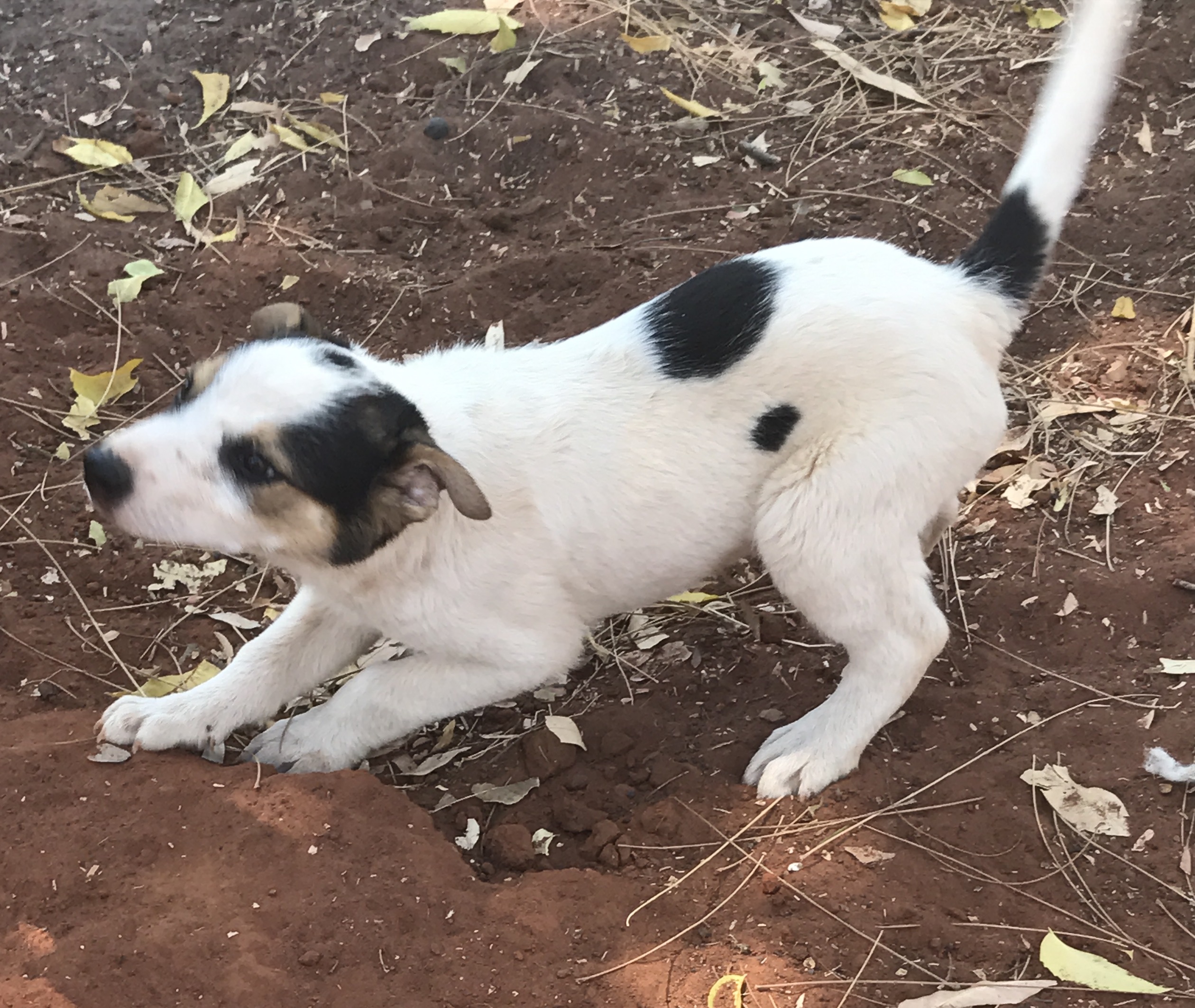 This little boy has had a difficult start in life. He travelled all the from Fregon to come into care with us. As it turned out all the puppies were incubating parvovirus. With good veterinary care he survived the illness, but it took a couple of weeks for him to start to thrive again. He was not very badly affected, so he has bounced back well, and is growing like a weed now. Because of this we have given and his littermates a little longer and they will travel with their full course of 3 vaccinations completed.