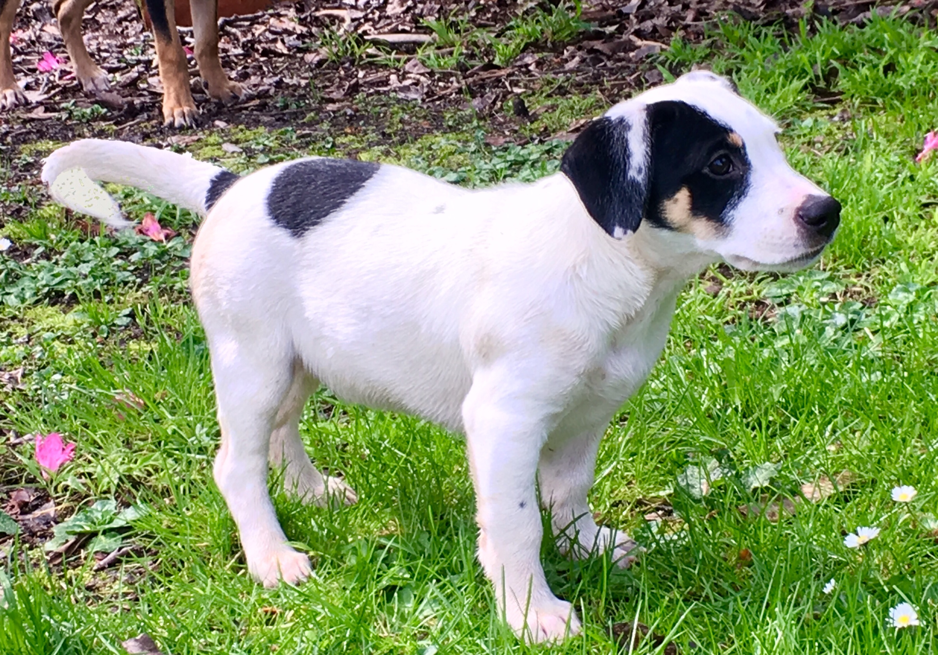 They are about 4mths old and well socialised with other dogs. Spot has short stumpy legs rather like a corgi with a stocky body. We believe mum is a lean average sized dog but no idea of dad.