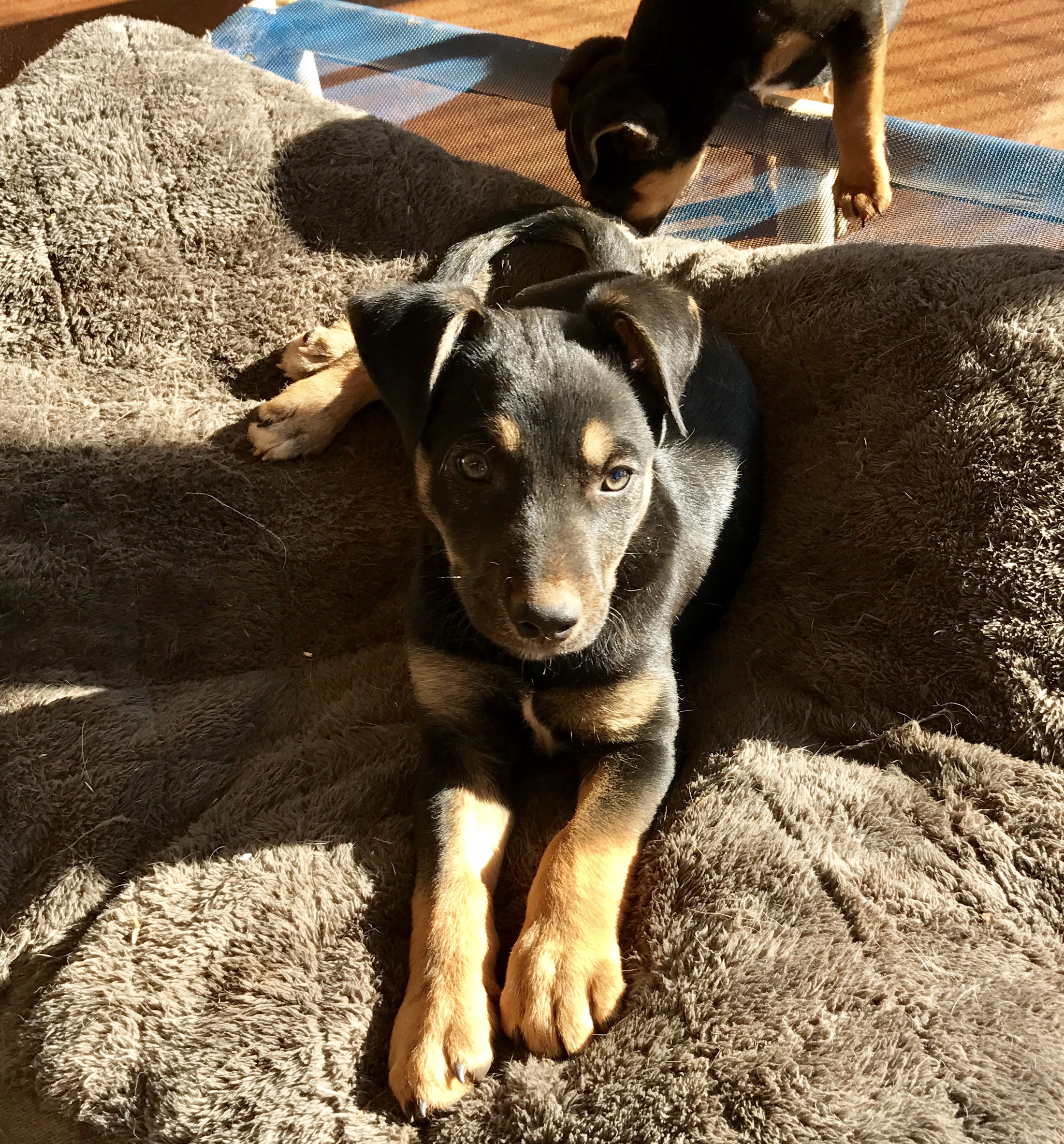 Gorgeous Atlas is interested in everything. He loves exploring outside in the garden and wrestling with his littermates in the dirt, collecting bits of sticks and generally keeping himself busy. He loves to play with the big dogs too, and keeps up pretty well. He also loves a pick up cuddle and some lap time and belly rubs. He and his siblings get on really harmoniously with the other puppies and with the big dogs as well. They are really good around the house and improving quickly with house training. He loves his dog beds and will share happily with another dog or puppy.