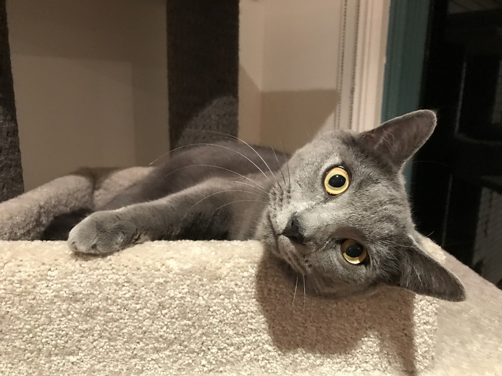 Hi, my name is Bouncy and I am a beautiful blue cat with loads of personality!!! As my name suggests, I do like to bounce everywhere (who wants to walk when you can jump!). When I come up for a pat or to rub myself against the furniture, I like to walk sideways, just because I can! I don’t really enjoy being picked up, but please pat me all you can, I looooooooooove pats!