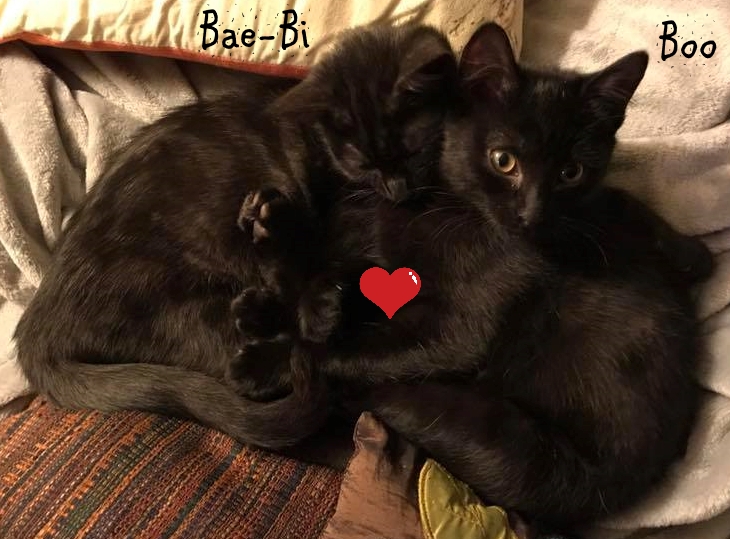 These girls are an inseparable packaged deal. Bae-Bi and Boo will only be homed together, and they must be indoor cats. Society today is far too dangerous for cats to be outside - especially dark girls who are far too brave and curious for their own good!