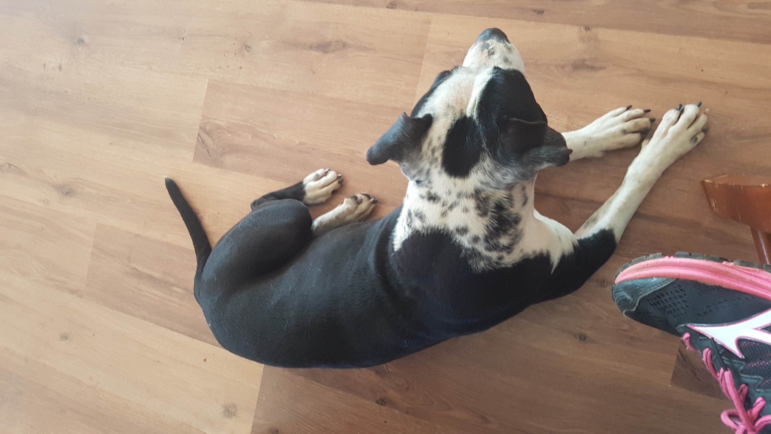 She is great in the car, good on lead, she doesn't jump and rarely barks. She isn't an escapee and if she is inside with her carer she is happy to follow you around and hang out.