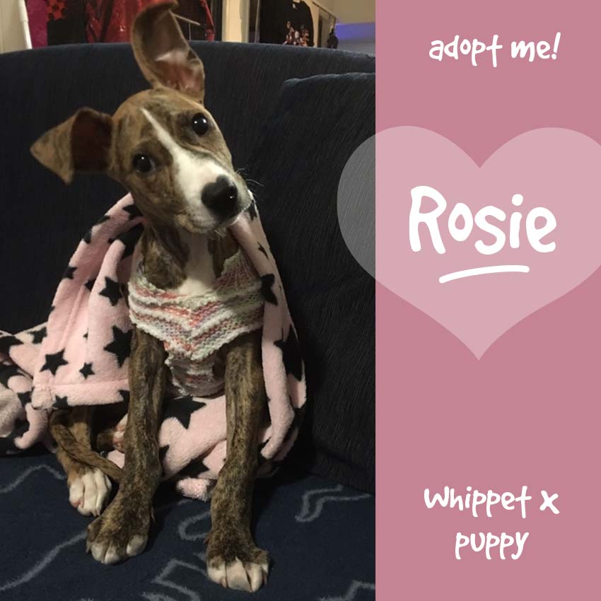 Rosie is a 16 week old, female, Whippet x puppy. She is a lovely, playful and friendly girl who gets along great with other dogs and kids.