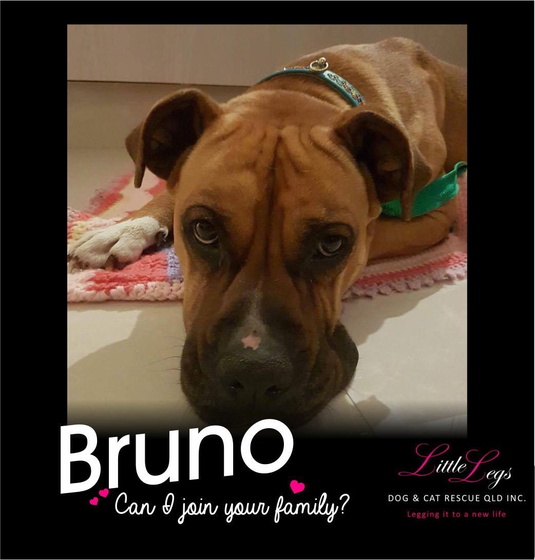 He just wants to be loved and be part of a family. He is currently in foster care with 2 cats , kids and a puppy and he is great . He needs a family who will have patience and work with him. He takes some time to settle in and trust ppl . Bruno only has 3 legs so needs a home without alot of obstacles or stairs/steps. He would love another dog for company but is also happy hanging with his family.