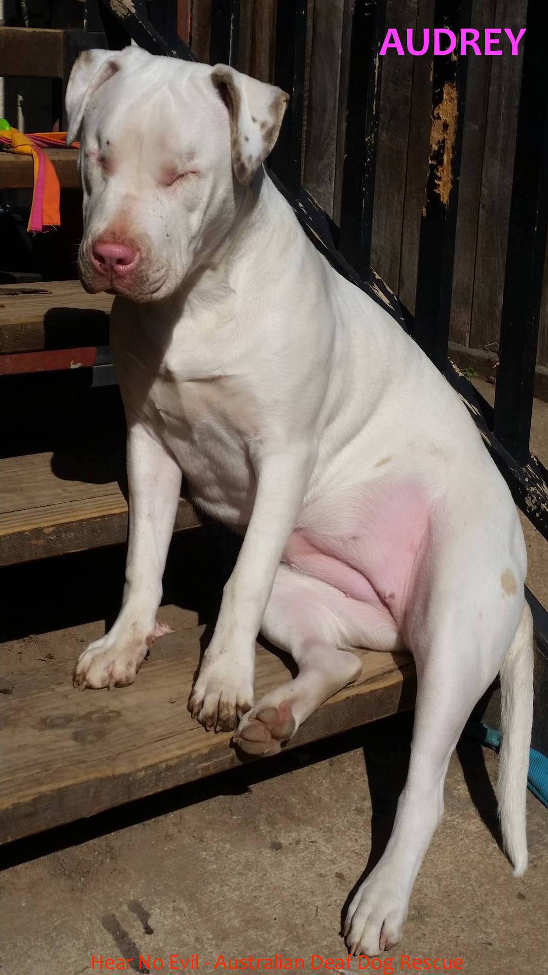 A family experienced with large breeds (particularly mastiffs) and that is committed to ensuring Audrey’s ongoing training and making sure she gets to be part of daily family life would be ideal. There is no expectation that Audrey’s adopters will have any experience with deaf and blind dogs and there’s certainly no need for that experience – life with a deaf and blind dog simply requires a different style of communication.