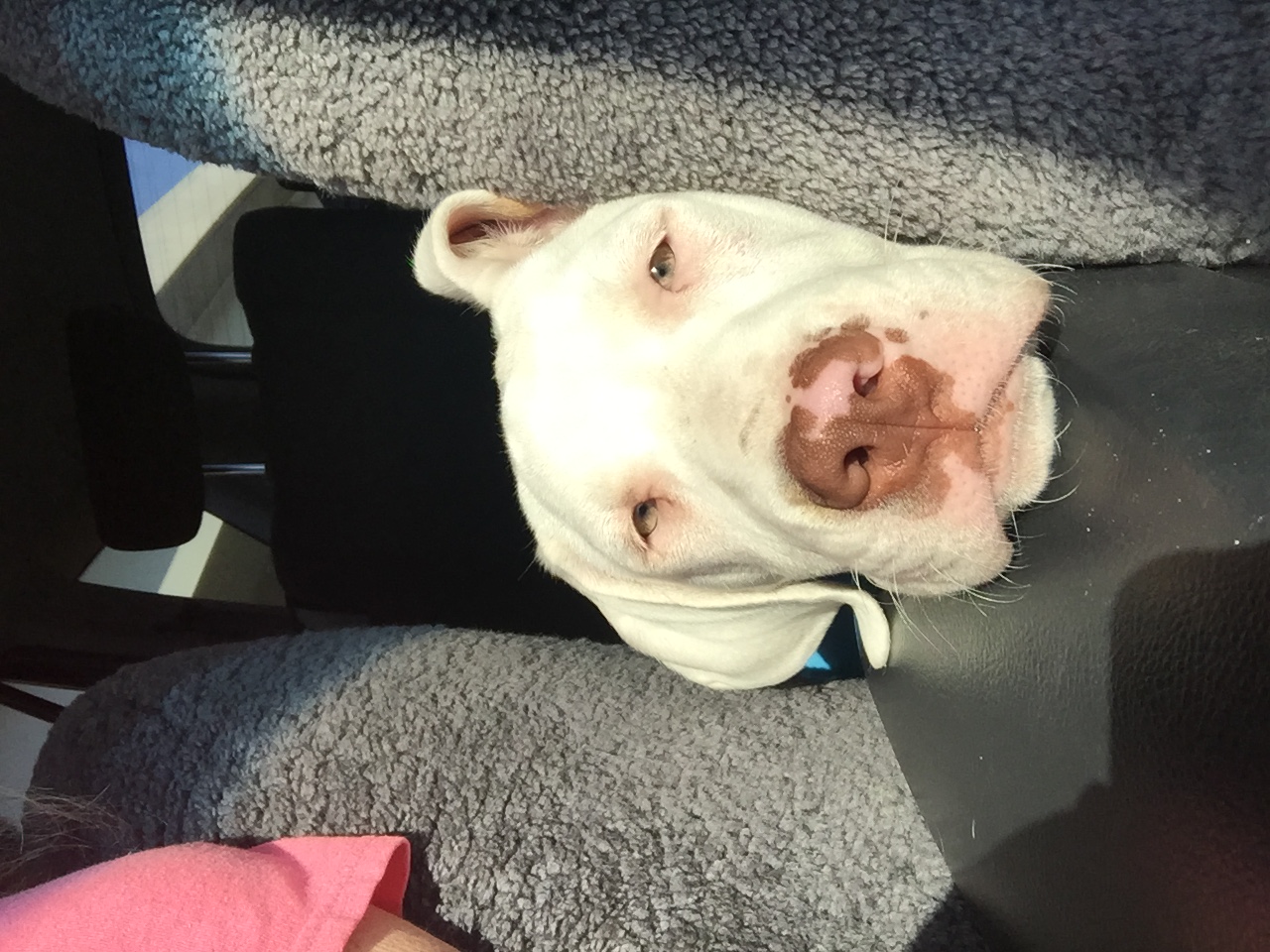 Rose is a happy young lady. When she gets excited she will lope around with a big grin on her face, and when she is calm she is either asleep on top of you or asleep right next to you (whichever you will allow). She will need someone who lets her sleep inside and continues her training. Rose will grow into a big dog (she is already enormous!) and her new family need to be prepared for that. She is currently living with another dog who she adores and has been around kids and lots of other dogs with no troubles. Ongoing socialization and training is required for her to grow into the gentle and loving family dog she so desperately wants to be. She is sooooo gentle and just wants to love you all the time. She will need someone prepared to commit to the next 10-15 years and not someone interested in her as a puppy but a life long friend.