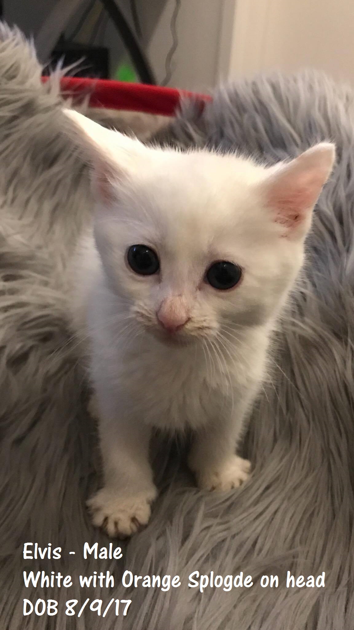 Elvis is a handsome young boy who has soooo much love to give. He is pure white apart from the smallest smudge on his head which is orange. Elvis was named Elvis because he was always yelling and screaming when he was first caught.