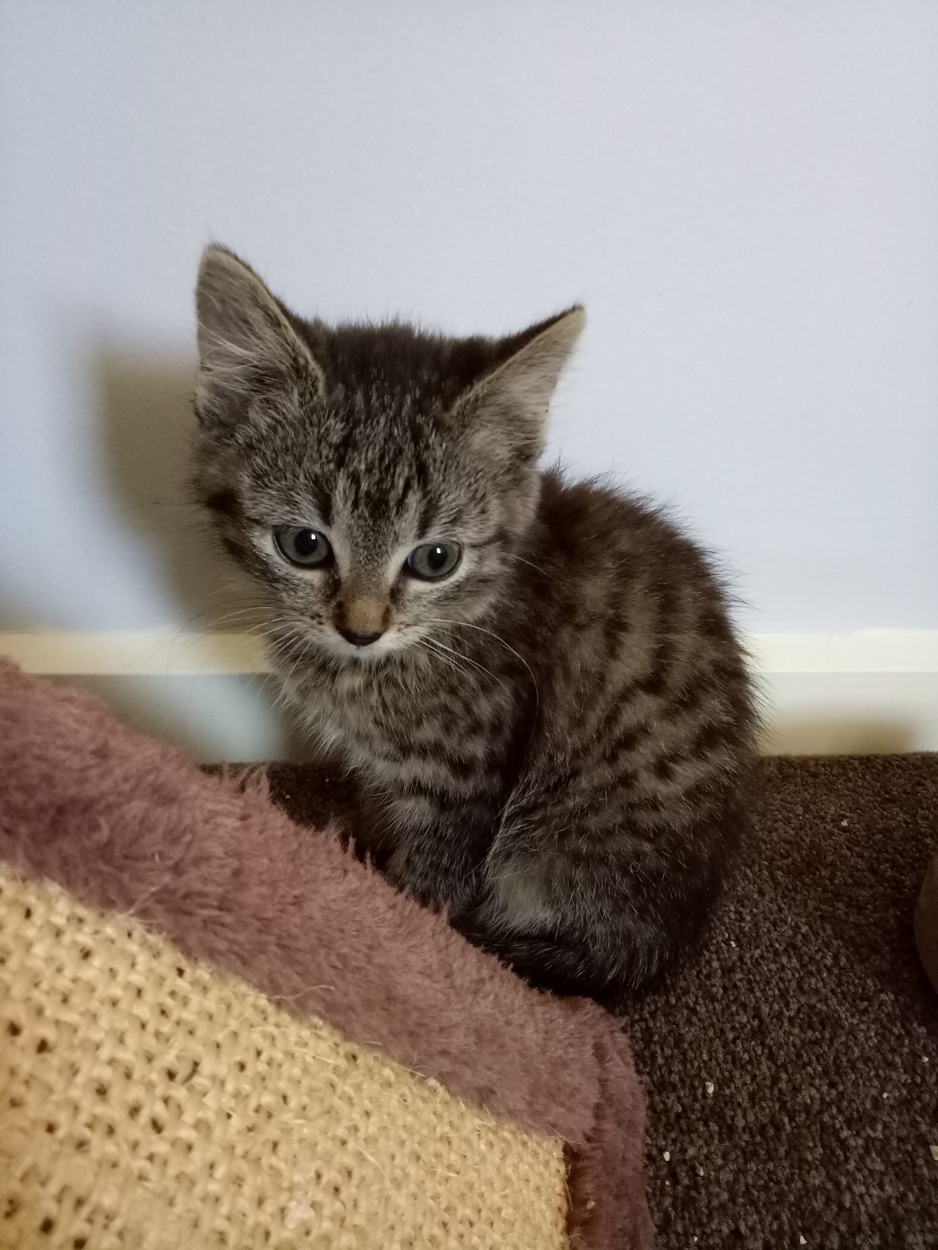 Shona is an adventurer! She has beautiful markings and a very sweet face. She has no fear and is happy to begin exploration immediately. She is also happy being cuddled and falling asleep on you and doing tiny kitten snores! She is a very expressive and happy kitten and loves to play with all her toys!