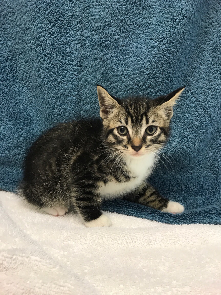 Wedges, her 2 sisters and brother were brought to us by a member of the public who found them alone outside their house. They were all scared at first but are now very sweet and loving!! They are currently 5 weeks so will be available for viewing and adoption from the 20/11/17. Wedges is a tabby female