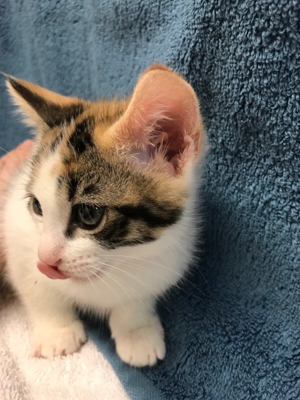 Chips, her 2 sisters and brother were brought to us by a member of the public who found them alone outside their house. They were all scared at first but are now very sweet and loving!! They are currently 5 weeks so will be available for viewing and adoption from the 20/11/17. Chips is a tortie and white female.