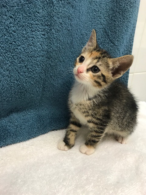 Fries, her 2 sisters and brother were brought to us by a member of the public who found them alone outside their house. They were all scared at first but are now very sweet and loving!! They are currently 5 weeks so will be available for viewing and adoption from the 20/11/17. Fries is a tortie tabby female.