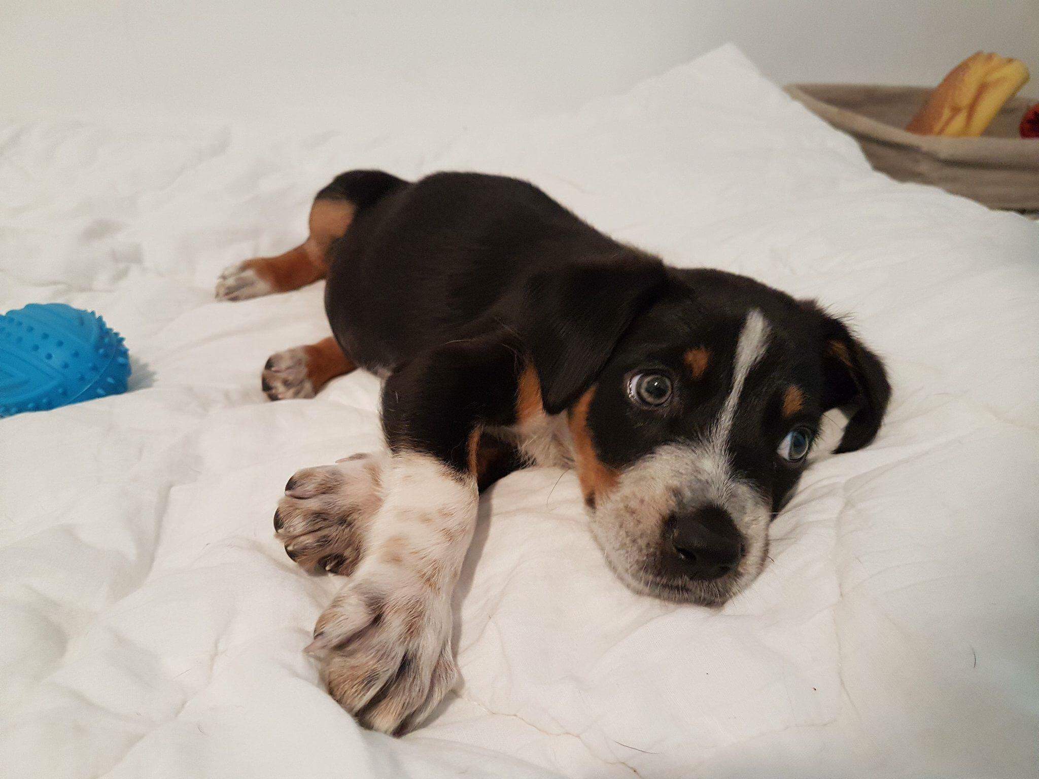 Sparky has a beautiful sweet face and is a super sweet boy with loads of energy. He loves to play with his siblings and then crash and nap before the next round of play time. He absolutely loves attention from humans, big dogs and his siblings. He would love to find a home where he can sleep cuddled up with his family and get loads of attention. He loves playing with all his toys (especially his tug toy), sticks, munching on roast chicken and being around his humans. As he also loves to follow around the big dogs endlessly, it would be best for him to go to a home with another dog. The second he spots another dog or human, off he goes in pure happiness and excitement to socialise and play.