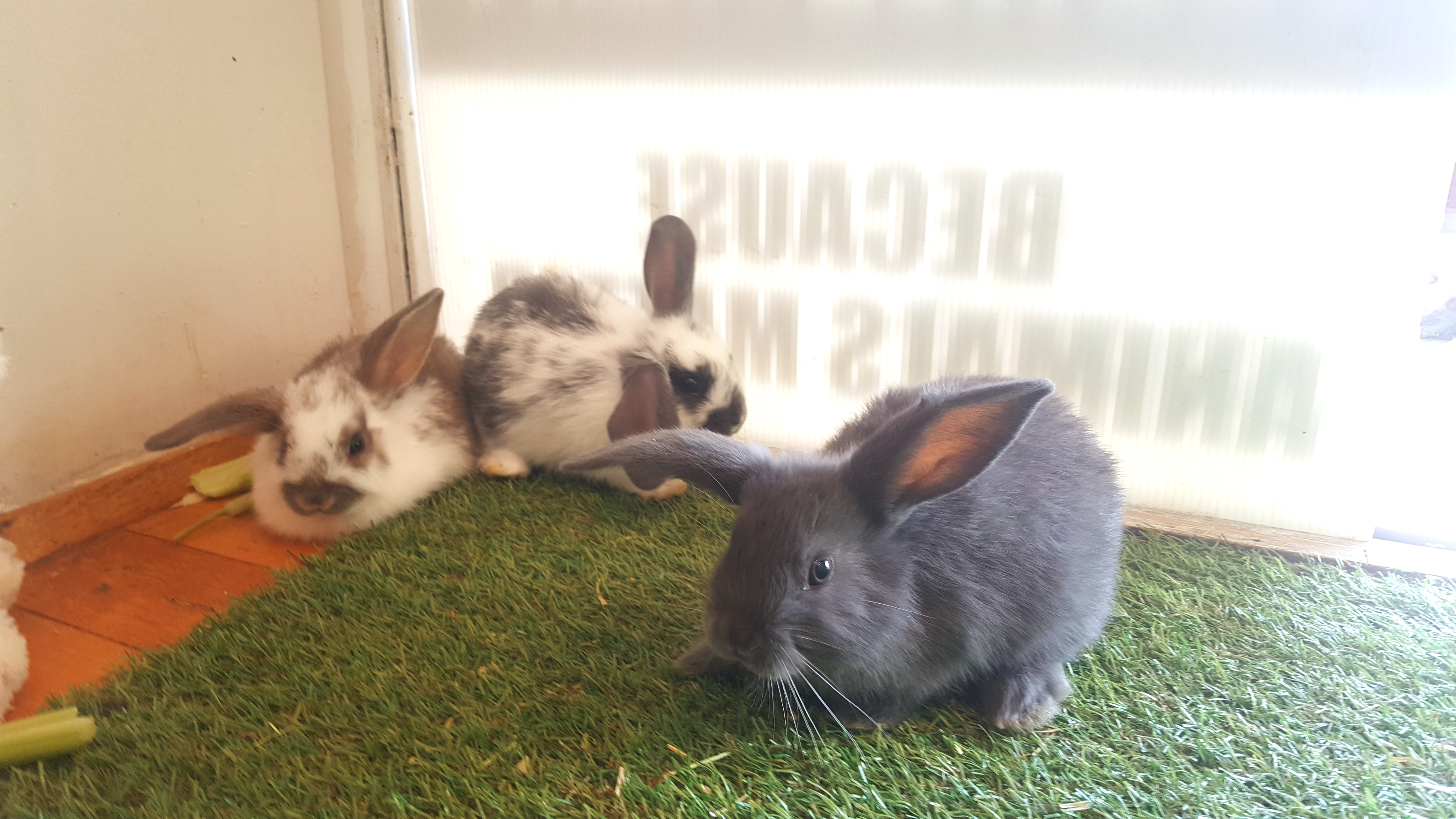 These little guys are very out going allready. They are getting along with our resident rabbit and are eating hay and vegis well. Being a mix of mini lop and mini rex they will be fairly relaxed in nature.