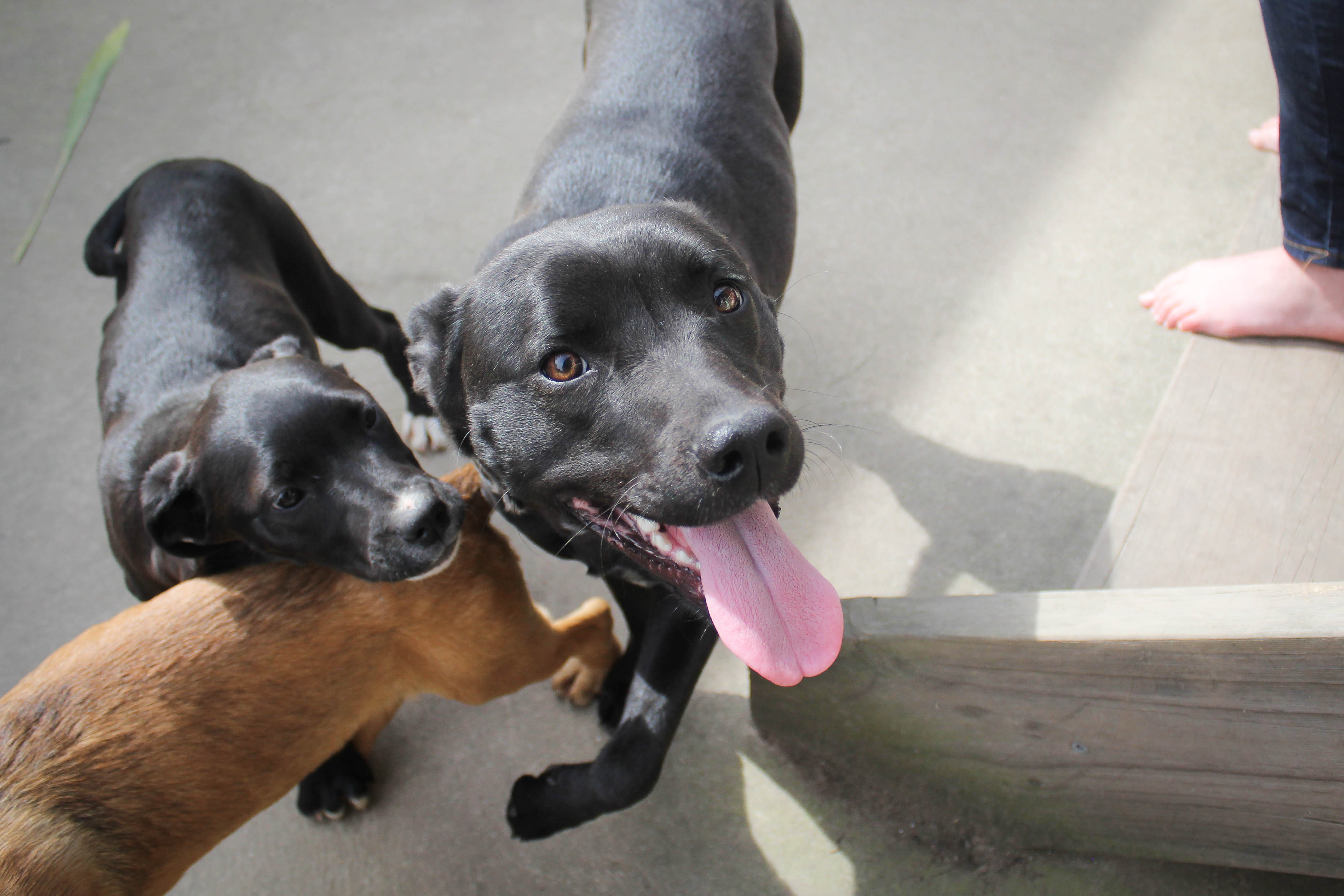 Sophie loves other dogs who also like to rough house a lot, and sleep a little. She can come on to them a little strong/dominant when first meeting but settles and accepts them quickly. A home with another dog would be great for this energetic and playful girl.