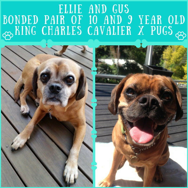 Gus (10 years) and Ellie (9 years) are Pugaliers, a cross between a King Charles Cavalier and Pug. They are best mates and have been together since puppyhood so we really need them to stay together as they are a bonded pair.