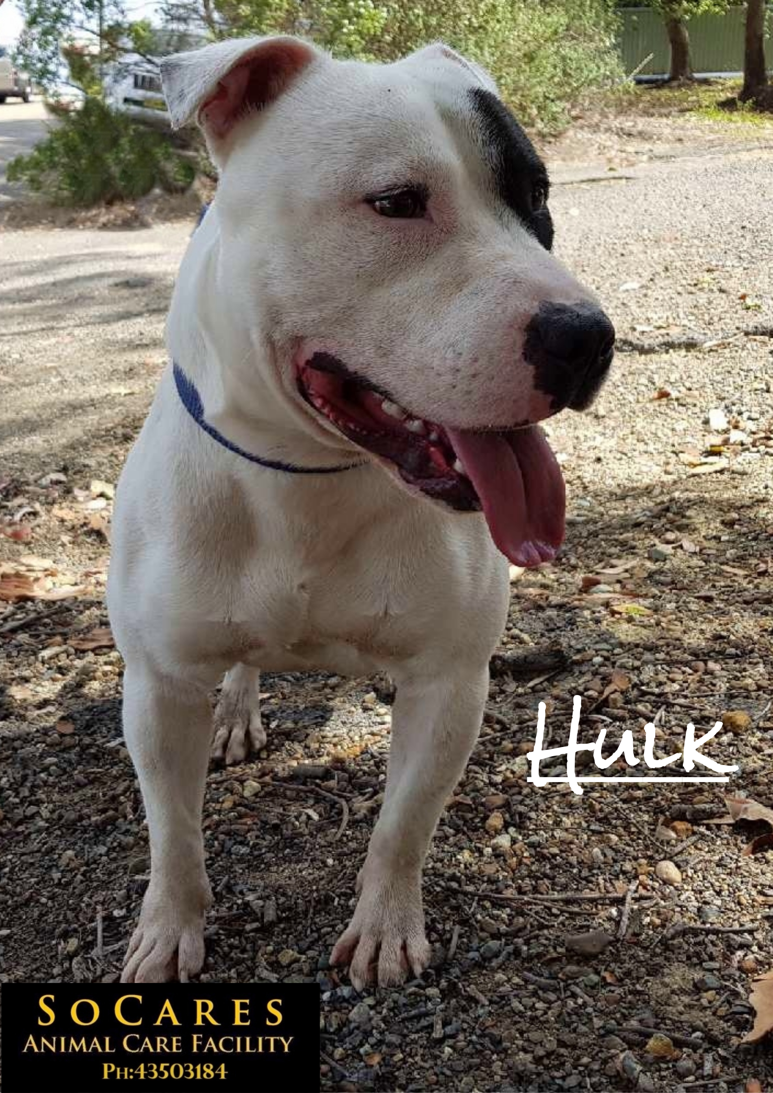 Hulk is a very likeable, striking boy. He is built like a tank but Hulk is a softie. Hulk loves life, always happy and welcomes everyone with enthusiasm. Hulk is still learning his manners while on the lead. He does tend to pull and will need some further training to correct this. Hulk is dog friendly however he can overwhelm other doggie friends with his excitable behaviour. A meet & greet will be essential if you have another doggie family member.