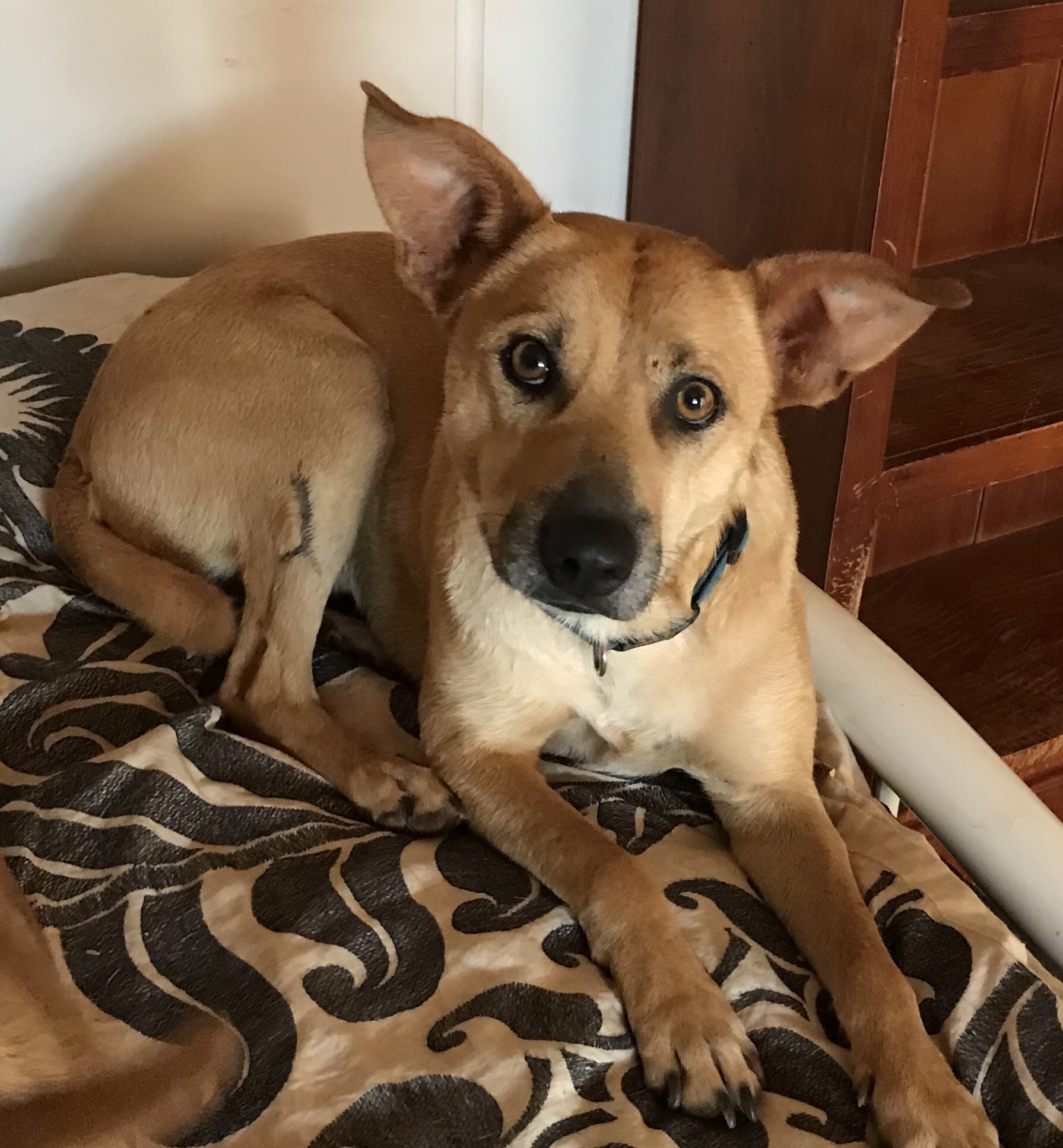 Juju is a gorgeous little dog. At 15 kilos she is not very big, but copes with the big dogs and is lovely to the little dogs and puppies as well. While she gets on well with the other dogs and enjoys a play, she is really very focused on her human and would love to have one all of her own to attach to. She would be a faithful little shadow and cuddle mate to someone who would love and care for her. Her favourite place for a nap in the evening is on the back of the couch, with her head just next to my shoulder, where pats can be maximised. Juju loves her walks and especially being allowed to be off lead as she loves exploring. She doesn't go too far and comes back nicely to a whistle. You don't need to worry about her getting lost or running away, as she is very attentive to her human and would be mortified if she misplaced me! She walks on the lead as well, and we usually practice that on the way home.