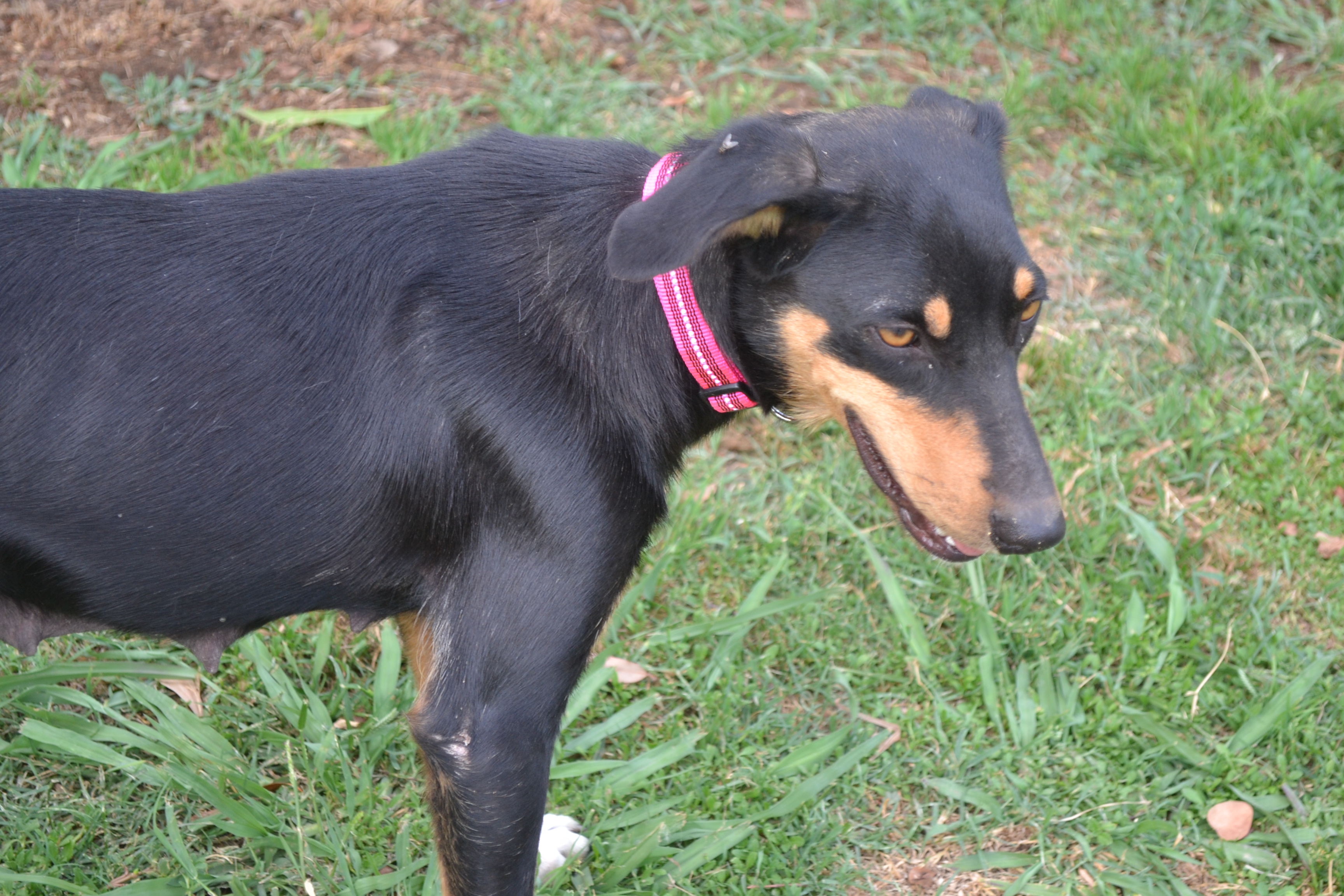Suzie has a sad story, she was surrendered with her pups to a remote pound, unfortunately she was separate form her pups and came in care as a very sad emaciated girl. Suzie is 2-3 years old, Kelpie x probably Border Collie. This girl would be one of the most beautiful, well mannered, affectionate Kelpie I have ever fostered. Suzie is not overly active for a Kelpie, a little shy at first but warms up very quickly, think she has not had any attention or affection with her previous owner. She would be suited to a family with a large block or few acres, another doggie companion would be good but not essential as long as she is not left for long periods of time as Suzie loves human company and loves to be your constant companion. This sweet girl has come out of her shell and is enjoying playing with the other dogs, she is fine with dogs both large and small and no problems with cats.