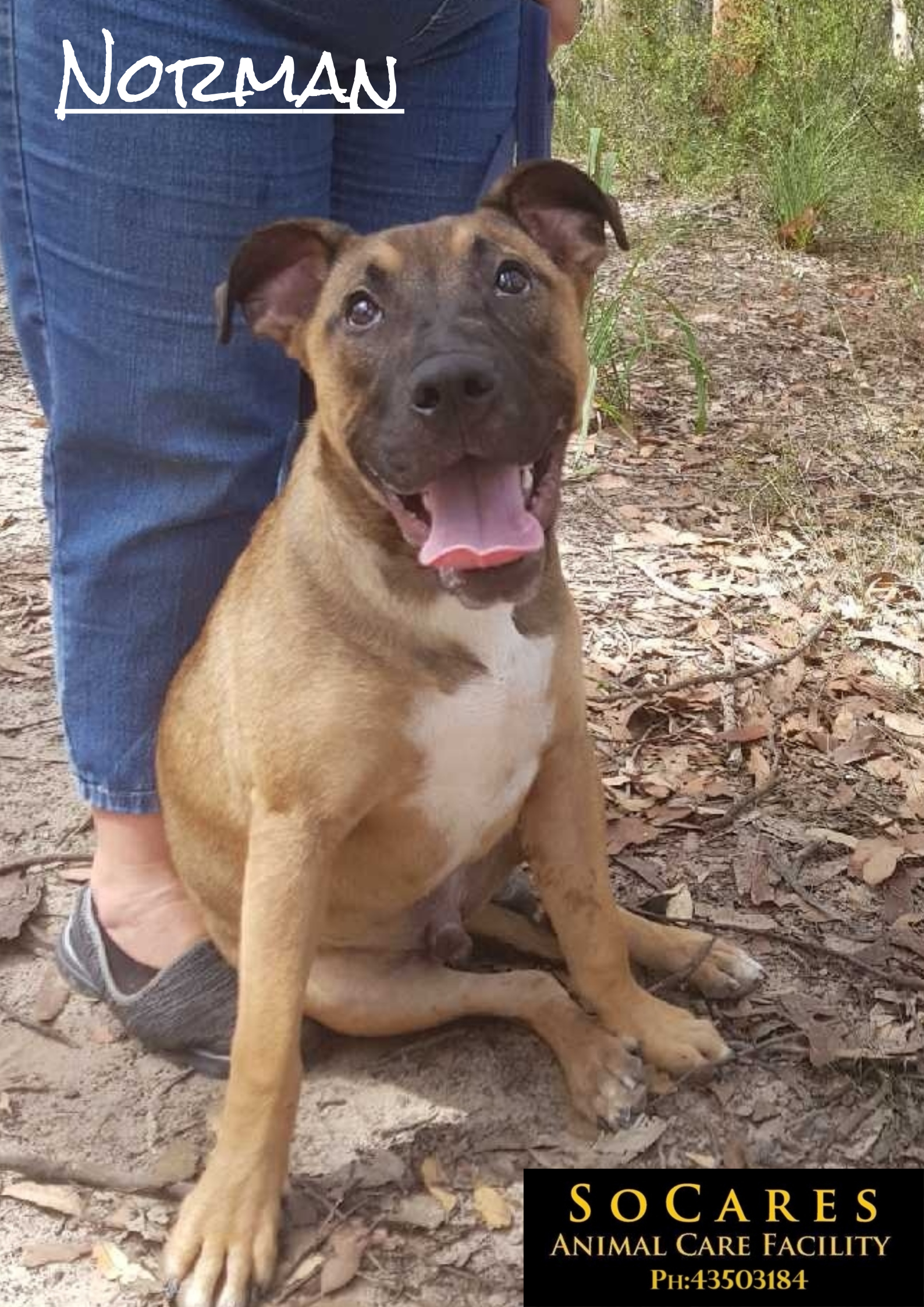 Norman is a big bundle of love. He is always happy and greets you with lots of enthusiasm. Norman is still a puppy. He will need ongoing training, stimulation to keep him active and content. Norman is still learning his manners on the lead however he loves going for a walk. Norman appears to be dog friendly.
