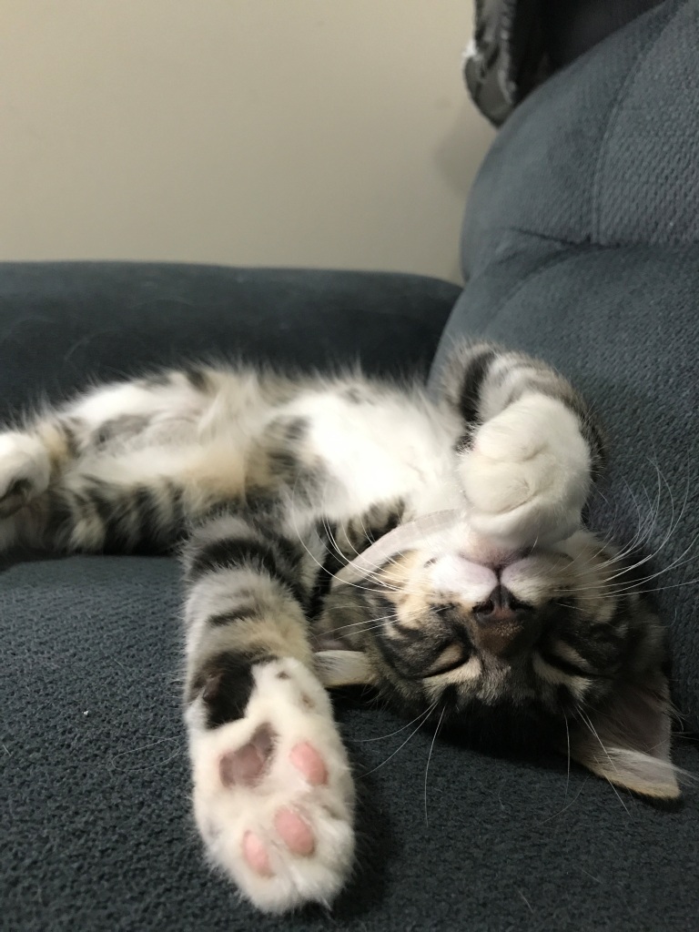 I have the loudest purr which I burst into when anyone looks at me, the is cemented in by the first pat and continues for as long as I can. I love to watch the world going by on the cat tower and can spend hours up there watching my foster brothers and sisters play. But when it is my turn to play I am an acrobat on that cat tower and can hang off it and climb like there is no tomorrow.