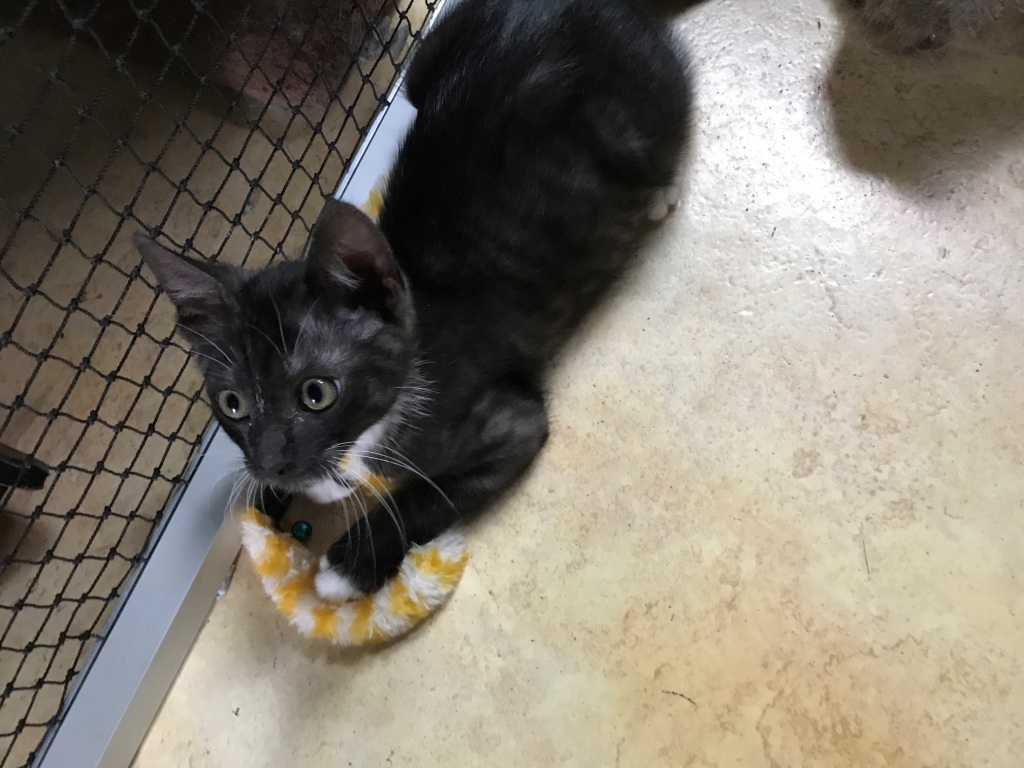Hi my name is Tiger. I have the most amazing colouring, I am a black smoke with beautiful white patches. I am an adventurous kitten and love to be around my human to go where they go. The world is an exciting place and I love to know what is going on. If I am exploring and I get scared I will run back to my human and hide between their legs.