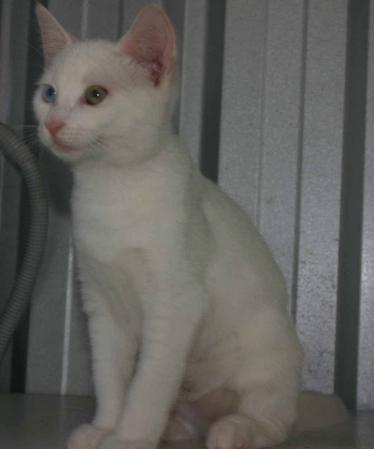Lucky is a very pretty friendly little girl, she has one green eye and one blue eye, although she is pure white she is not deaf