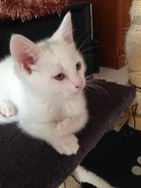 Bubby (male medium hair - White) is very like his mum Bianca and has quite the vocal range. He has a sweet nature and is usually the first to come and sit on the couch next to you for company . He is white apart from 2 paint brush swishes on his head. The tabby M is easily visible albeit all white. He is very playful and would make a great mouser ! He has ignored visiting dogs and gets on well with his siblings. He is also great with kids ! Being a white cat Bubby needs to be an indoor cat as being out in the sun could cause skin cancer due to his white coloring and pink features.