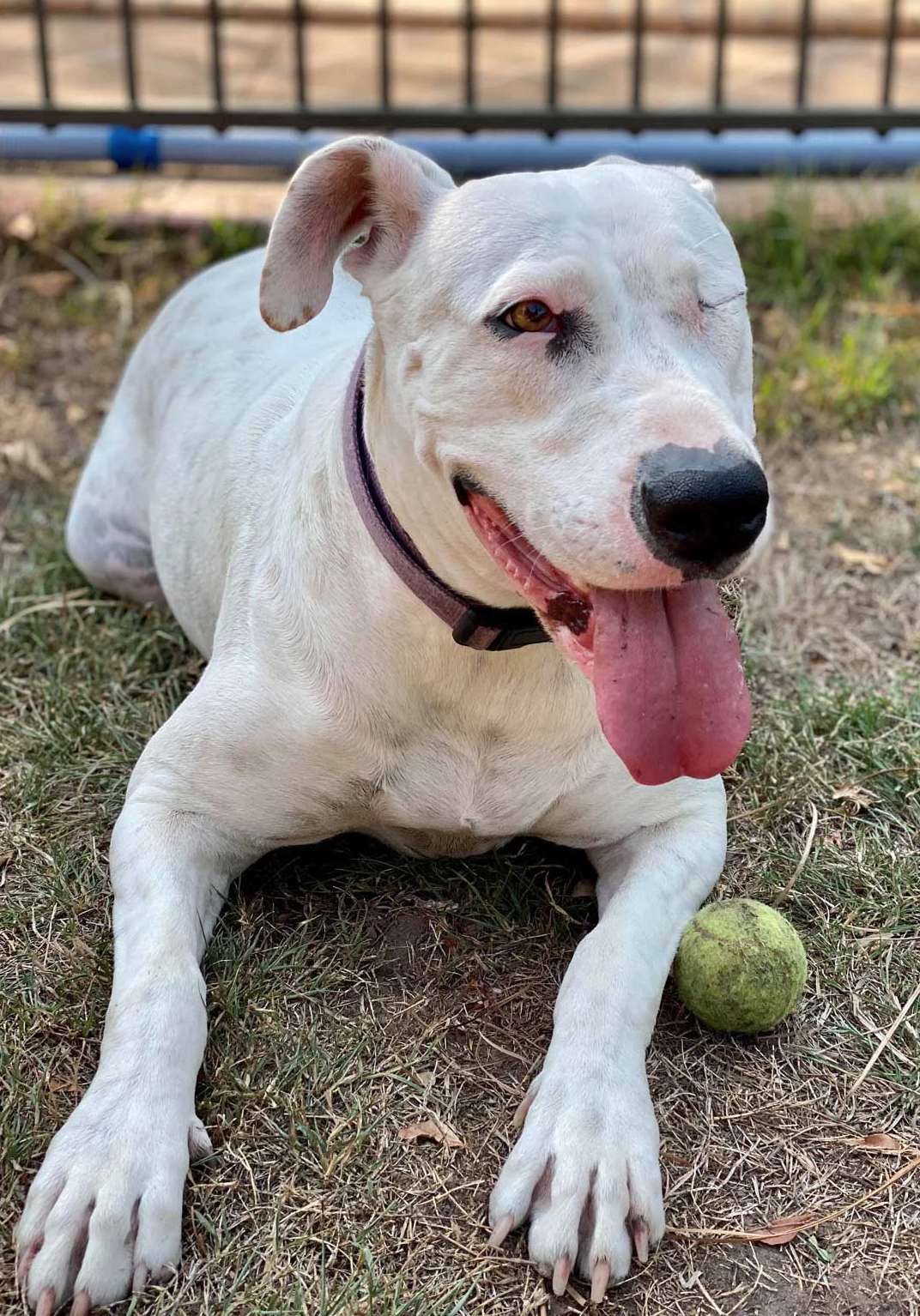 You might think only having one eye would hold me back but don't you worry, I still see perfectly fine with my remaining eye. In fact, I love spending my time playing tug-of-war and chasing balls; mostly with one already in my mouth!