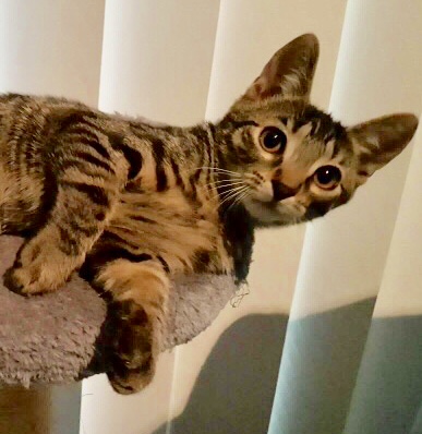 Milo is a very affectionate and loving tabby boy. He loves kisses and cuddles and will curl up on your lap or next to you. He also loves to play with his kitty playmate.