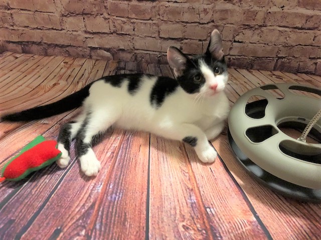 Jasper is a cute little black and white boy. The first to meet Jasper will want to adopt him!! I have never fostered a litter of kittens as affectionate and people orientated as Jasper’s litter. Come and meet him and his siblings and they will instantly be climbing all over you competing for your attention! They love their food and playing with their toys but as soon as someone is nearby they rush over purring looking for cuddles. If you think you would like to meet Jasper or his siblings phone to arrange a time to see them ASAP as their personalities will have them adopted in record time!!!
