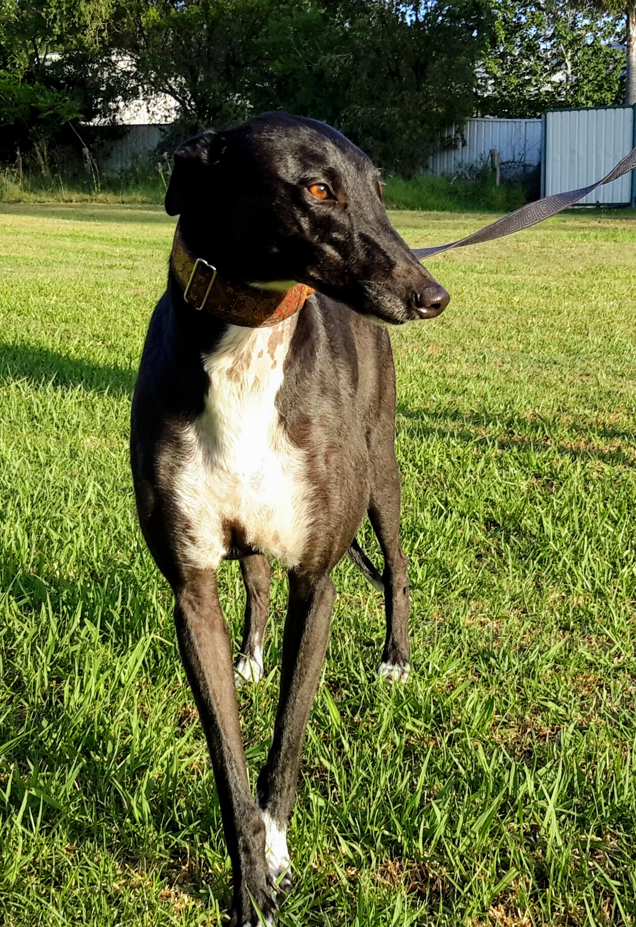 Wow! Who doesn't love a glossy black greyhound? This handsome lad is a stunner with his white lapel and white socks to go with his shiny black coat.