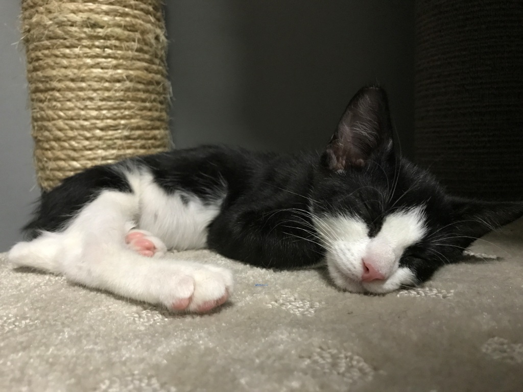 My name is Byte, my foster mummy called me this as I am the smallest of my brothers and sister so she thinks I am Byte-Sized. But as for personality, I have that in bucketloads. I love to sleep on my back and show everyone my beautiful white tummy.