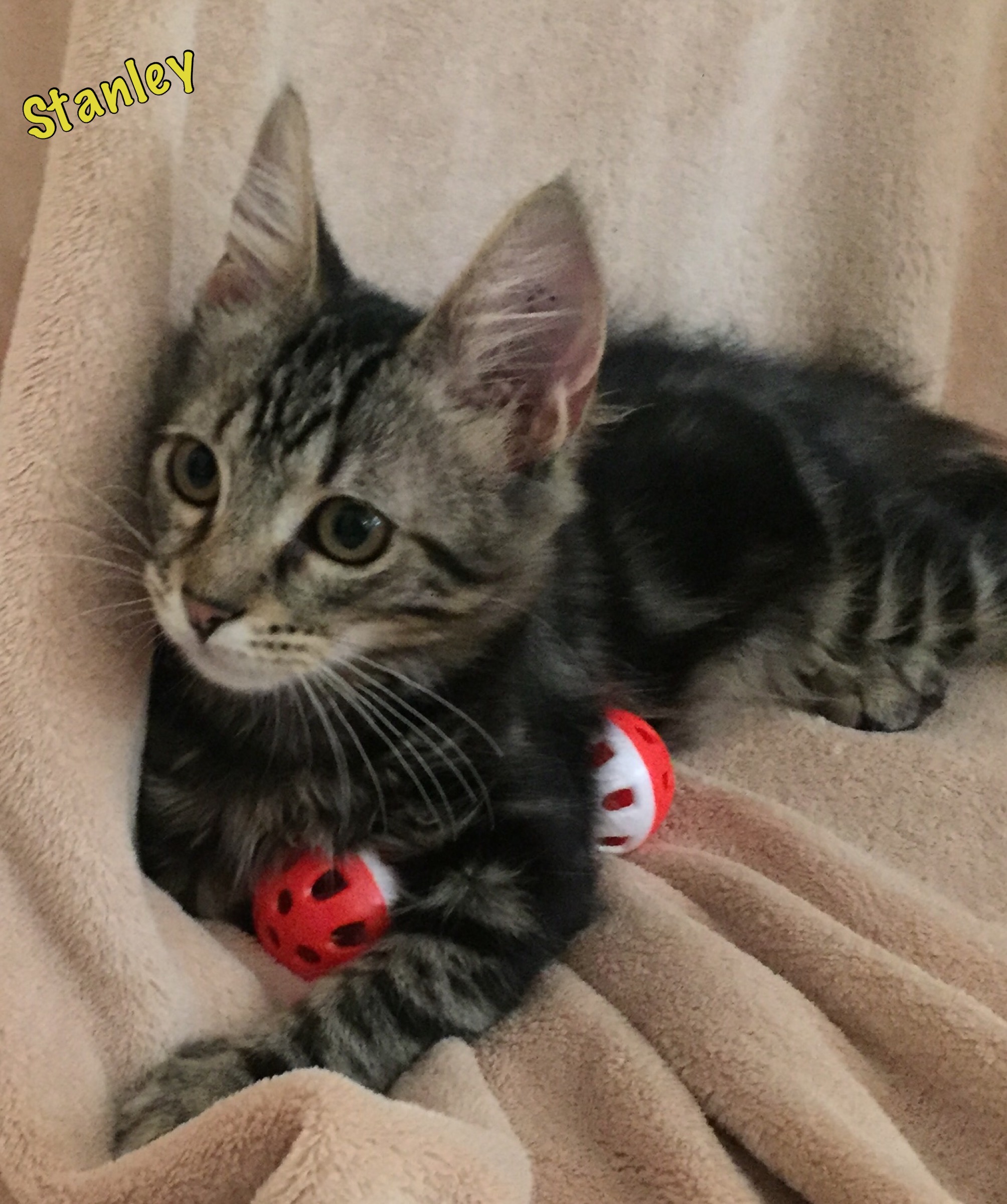 Fluff ball Stanley is over the top friendly and purrs as soon as he see you coming for him where as Owen takes his confidence from Stanley but is getting more and more confident.