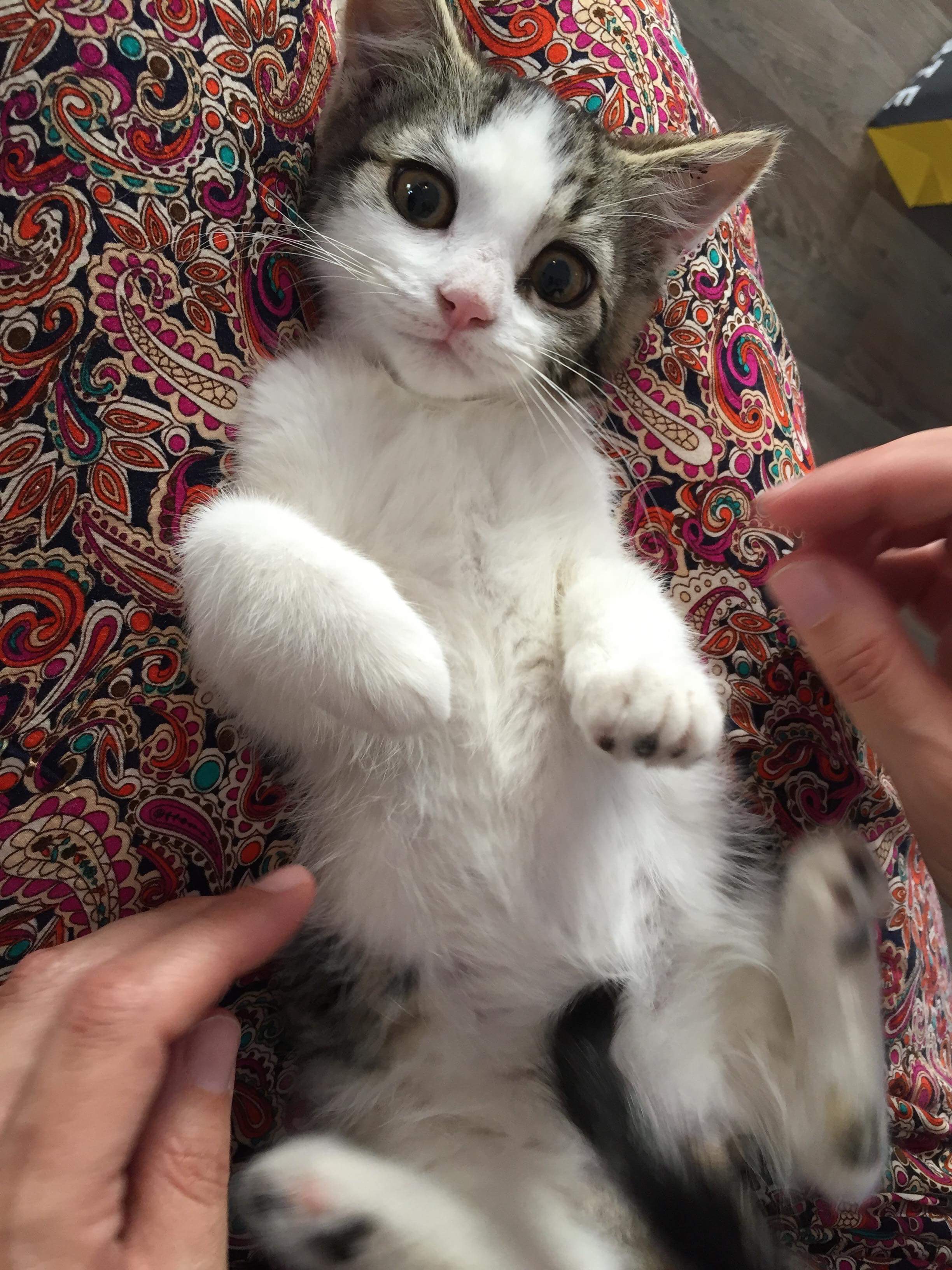Sit with me for 5 minutes scratching my back and I will be rolling over begging you to keep me! If you pick me please let me settle in a small room of the house for a few days so I’m not overwhelmed. Then I’ll be a happy, purry, normal kitten ❤️
