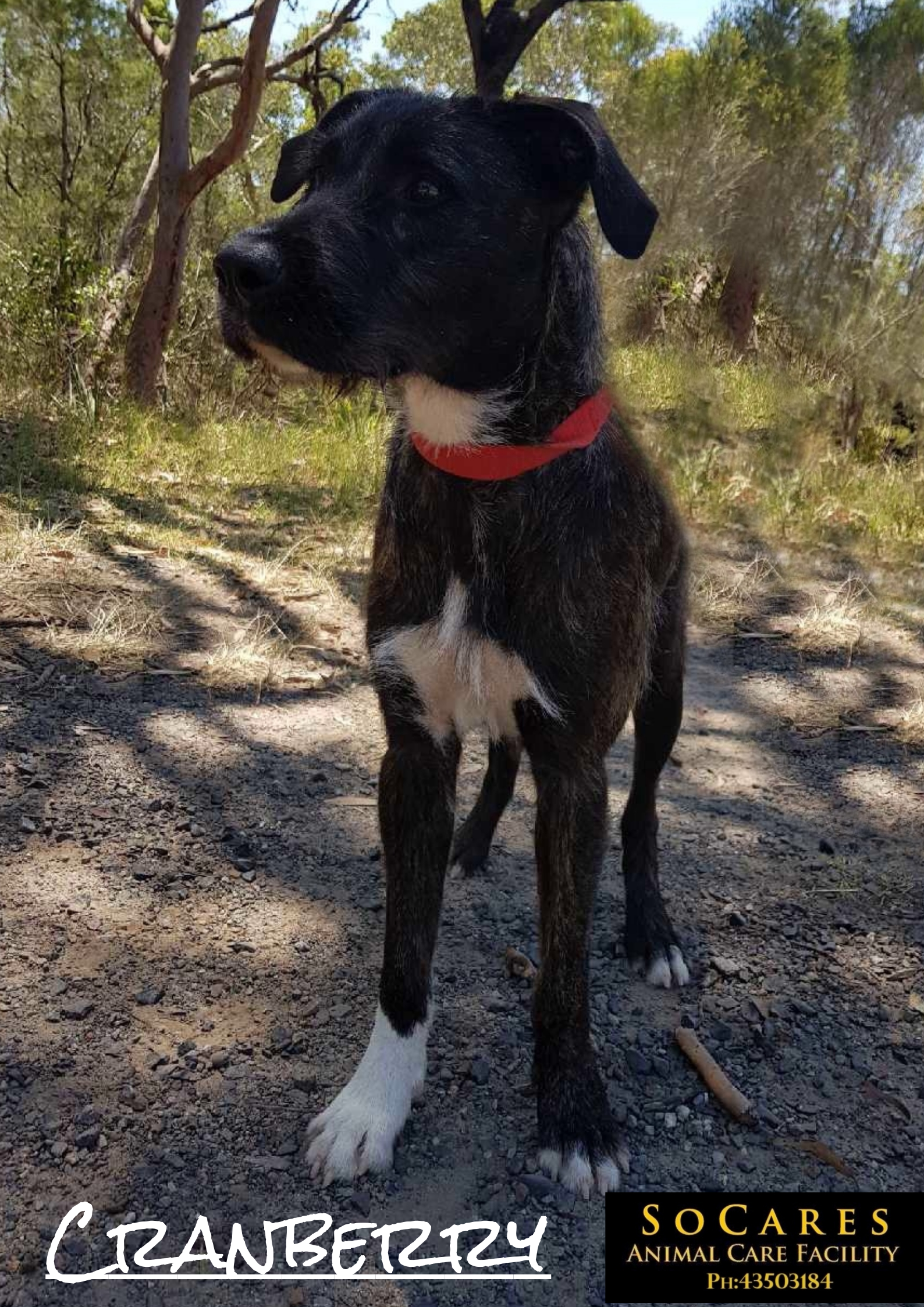 Cranberry came into our facility very timid and in poor condition. Cranberry is gaining weight, her coat is looking much better and her personality is starting to shine through. Cranberry has a lovely sweet nature and adores one on one contact with humans. We feel Cranberry has had limited socialisation with dogs and cats as she is reactive to them. Cranberry would be best suited to a family/person that is committed to building her confidence and providing her with ongoing training.